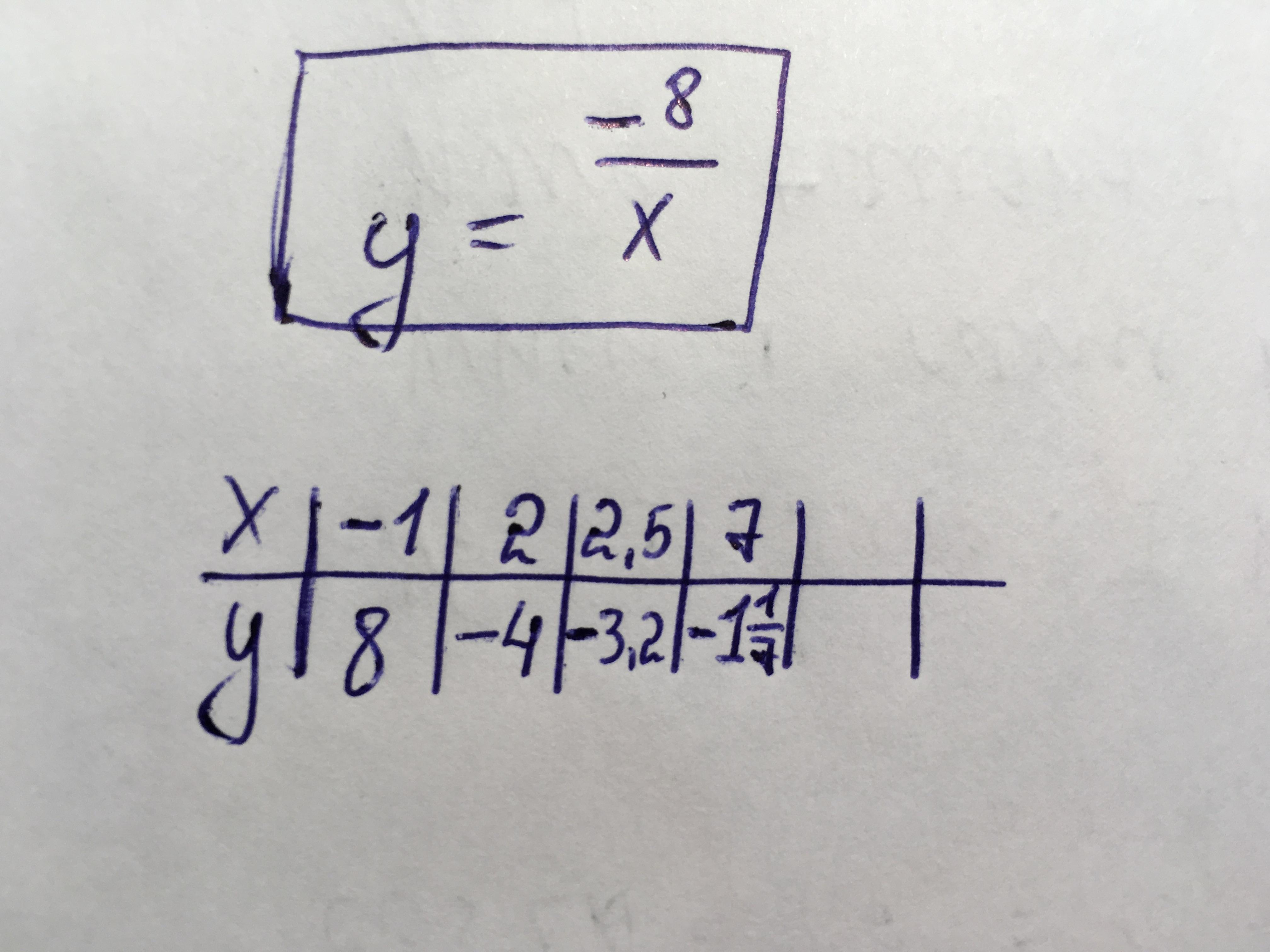 АЛГЕБРА: Функцию задано формулою y=-8/x. Знайти значення y, якщо: 1) x=-1; 2)x=2; 3) x=2,5; 4)x=7;