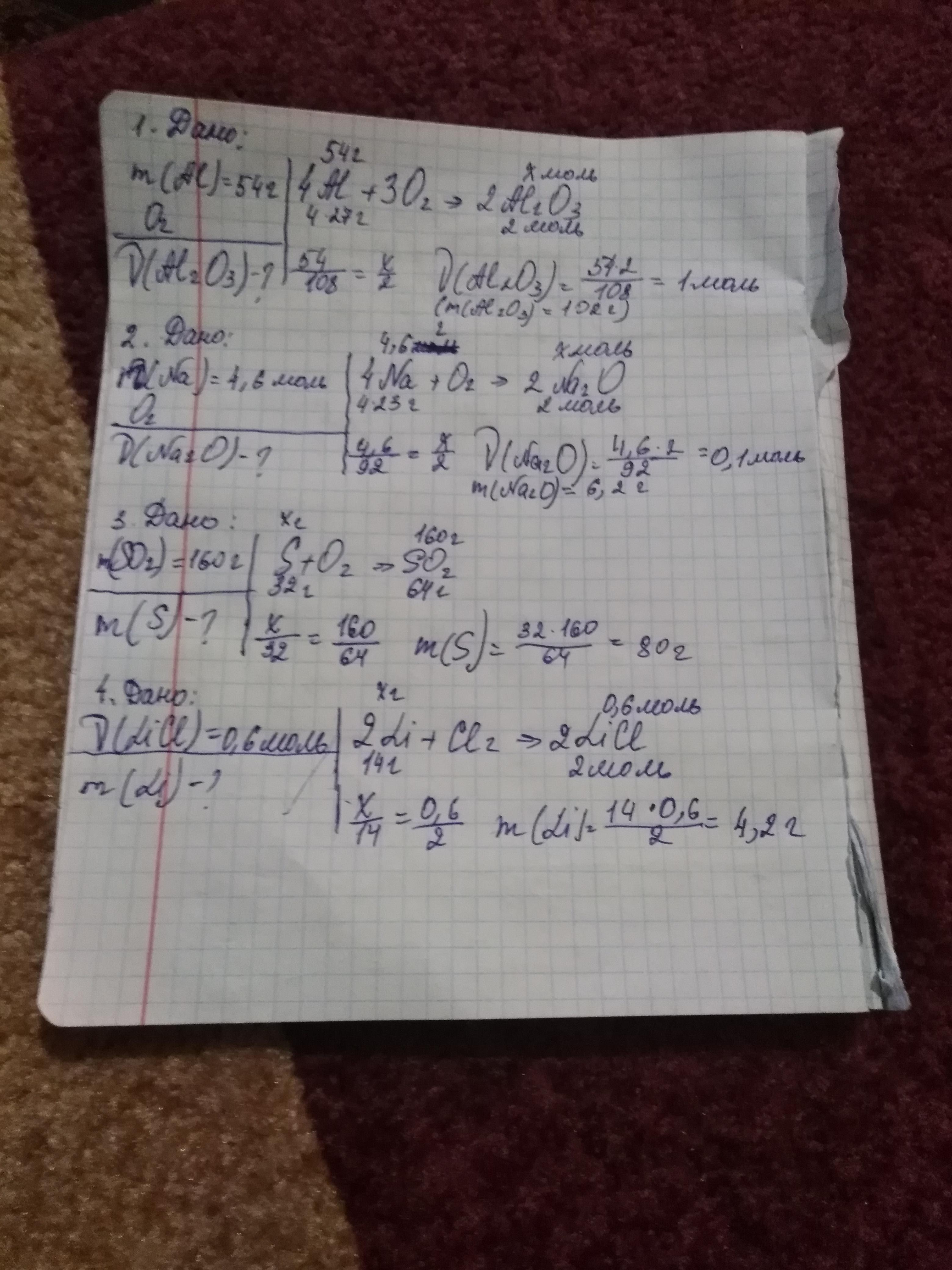 1. Вычислите количество вещества оксида алюминия, образовавшегося в результате взаимодействия алюминия количеством вещества 54г с достаточным количеством кислорода (4Al +3O2=2Al2O3).