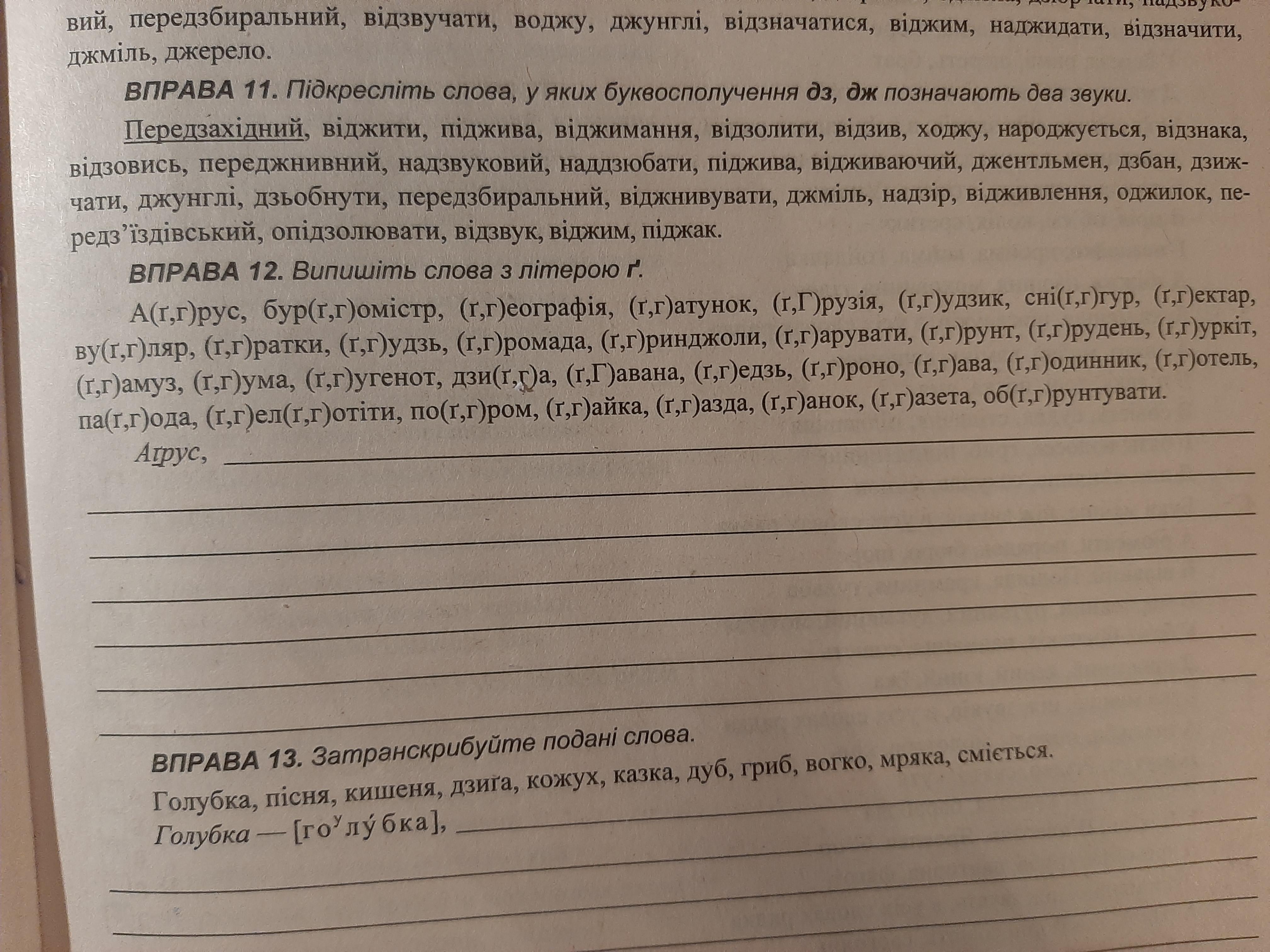 Аґрус, ґатунок, ґудзик, ґудзь, ґрунт, дзиґа, ґедзь, ґроно, ґава, ґазда, ґанок, обґрунтувати.