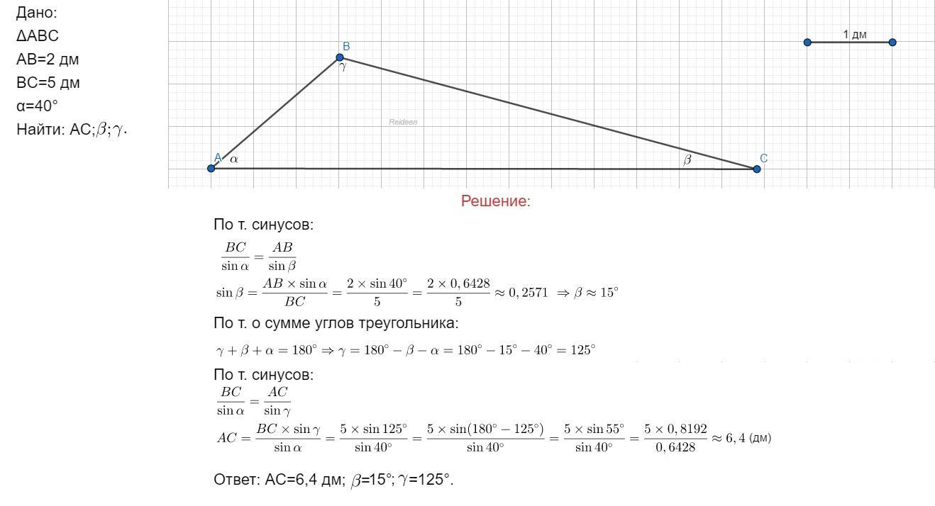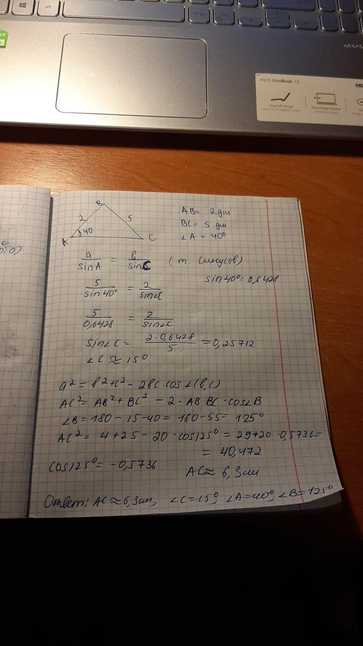 СРОЧНО. Найдите неизвестные стороны и углы треугольника АВС, если АВ= 2дм, ВС= 5 дм, угол А=40, там либо по теореме синусов, либо косинусов