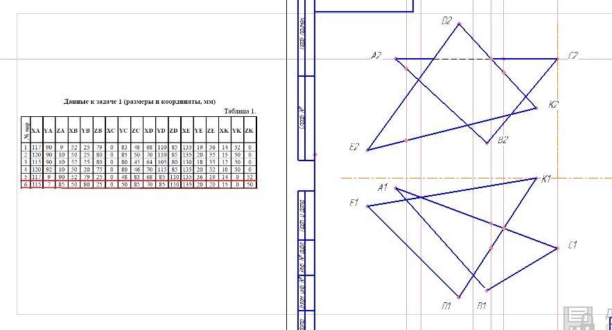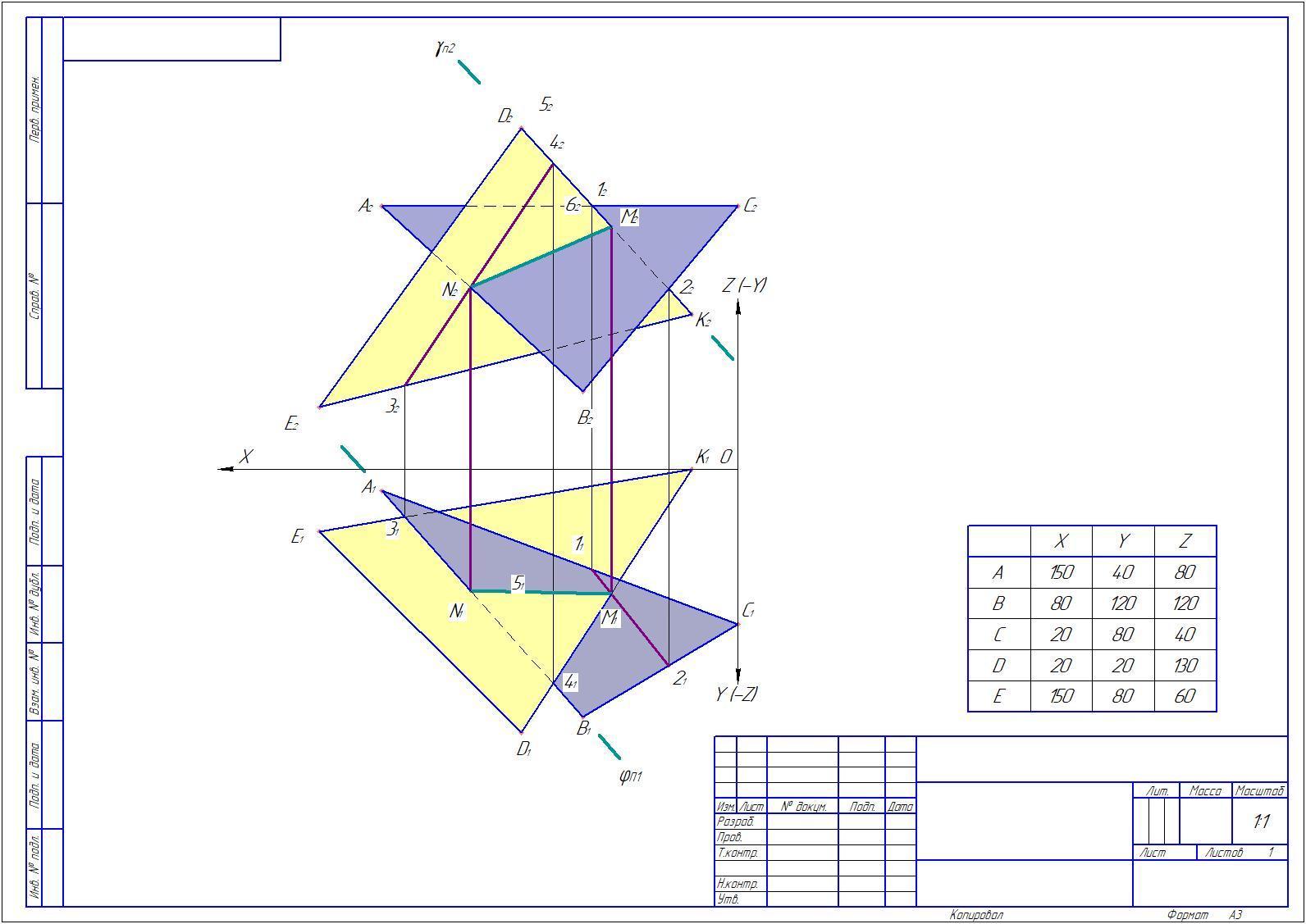 Помогите определить линию пересечения двух треугольников. Вариант №6. Чертеж построен в Компасе. Как с помощью вспомогательных плоскостей проекций...