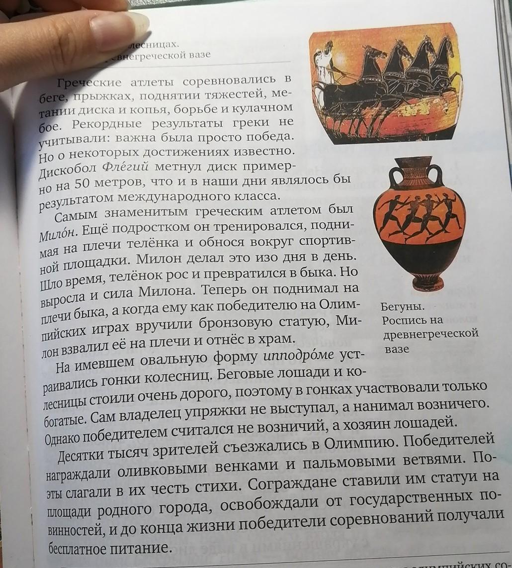 Ответ: 1 вопрос: чем награждали победителей? 2.Кто такой Милон? 3.В чем соревновались греки?