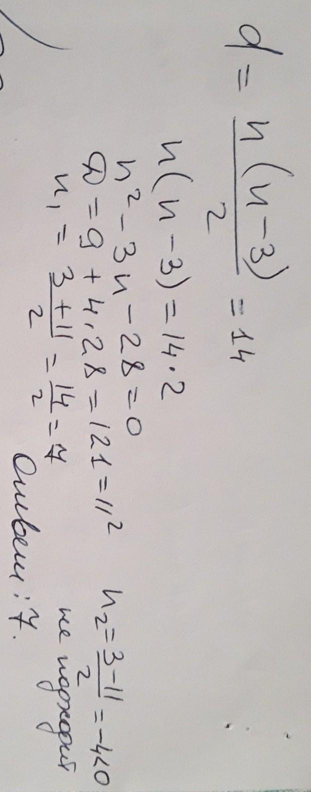 Для вычисления n (количество вершин или сторон) применим формулу: D = (n²-3n) / 2 , где D = 14 - по условию задания