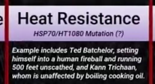 Термостойкость HSP70 / HT1080 Мутация (?) Пример включает в себя Теда Батчелора, ввергающего себя в огненный шар человека и бегущего на 500 футов невредимым, и Канна Тричаана, на которого не влияет кипячение растительного масла. ЗАКРЫТЬ
