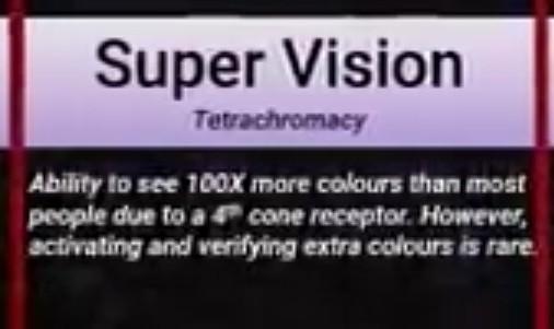Возможность видеть в 100 раз больше цветов, чем у большинства людей, благодаря 4-конусному рецептору. Тем не менее, активация и проверка дополнительных цветов редко