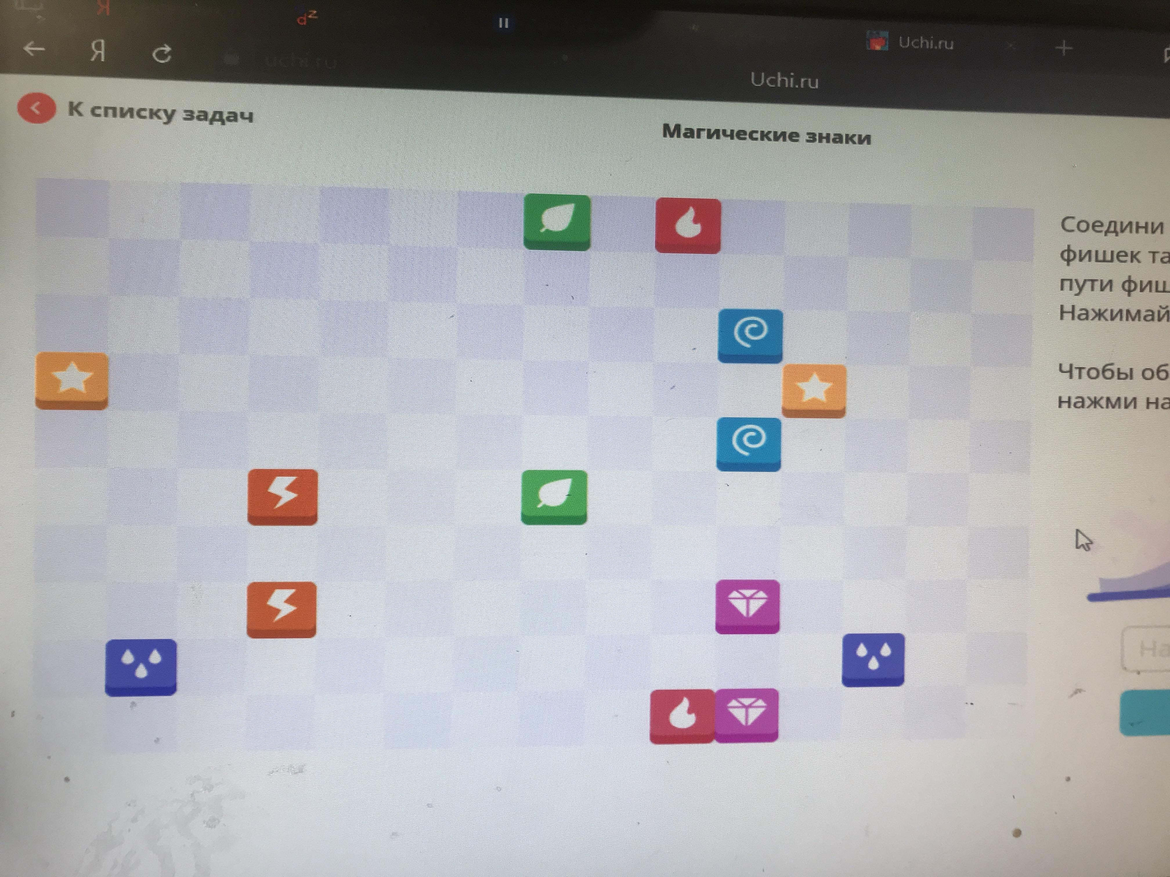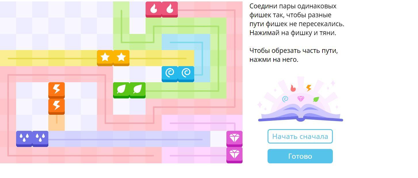 Соедини пары одинаковых фишек так, чтобы разные пути фишек не пересекались.