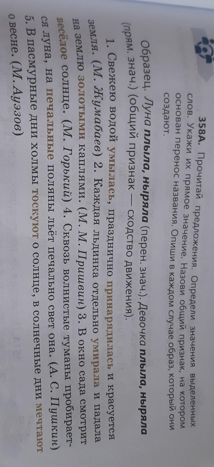5. Холмы тоскуют, мечтают (переносное). Ребята тоскуют по лагерю и мечтают скорее туда вернуться. (прямое) (общий признак - сходство действий)