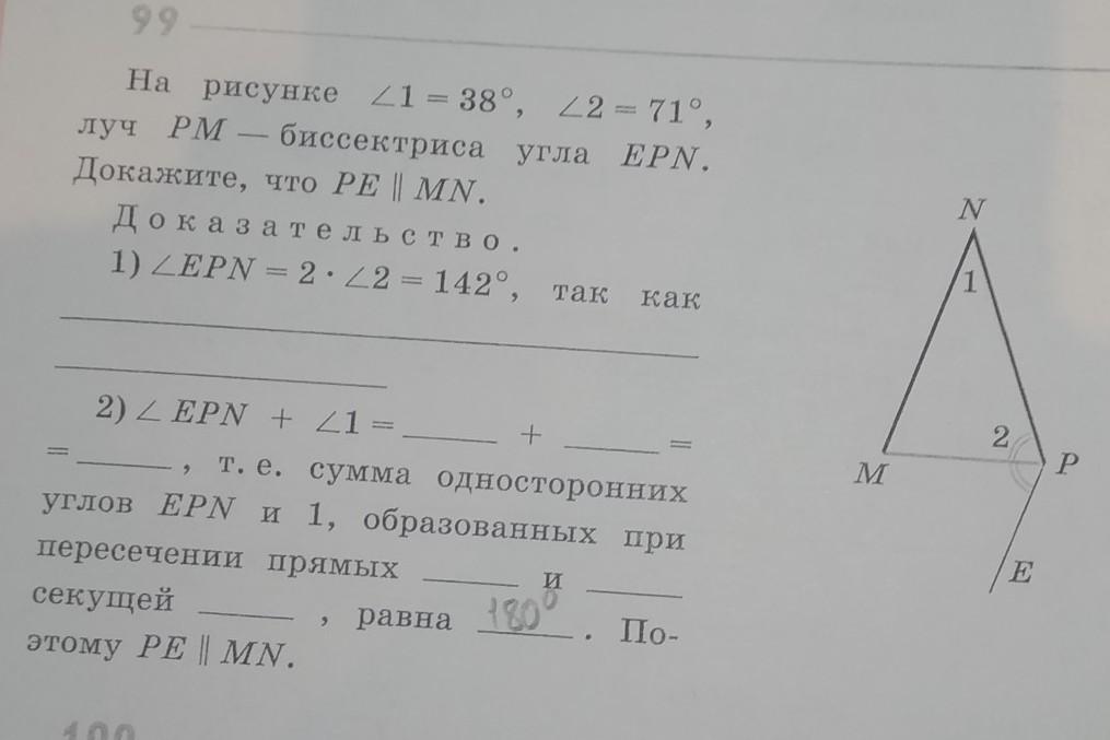 2) Угол EPN + угол 1 = 142° + 38°= 180°, т.е. сумма односторонних углов EPN и 1, образованных при пересечении прямых PE и MN секущей PN, равна 180°. Поэтому PE||MN. Доказано.