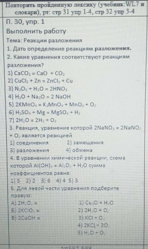 1. Реакция разложения - реакция, в ходе которой из сложного вещества образуются более простые вещества ( можно сказать вещество распадается на составляющие его вещества, но это происходит не всегда).