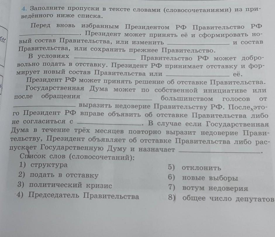 Перед вновь избранным Президентом РФ Правительство РФ общее число депутатов. Президент может принять её и сформировать новый состав Правительства, или изменить структуру и состав Правительства, или сохранить прежнее Правительство. В условиях вотума недоверия Правительство РФ может добровольно подать в отставку. Правительство принимает отставку и формирует новый состав Правительства или отклонить её. Президент РФ может принять решение об отставке Правительства. Государственная Дума может по собственной инициативе или после обращения Председателя Правительства большинством голосов политического кризиса выразить недоверия Правительству РФ. После этого Президент РФ вправе объявляет об отставке Правительства либо распускает Думу и назначает новые выборы.