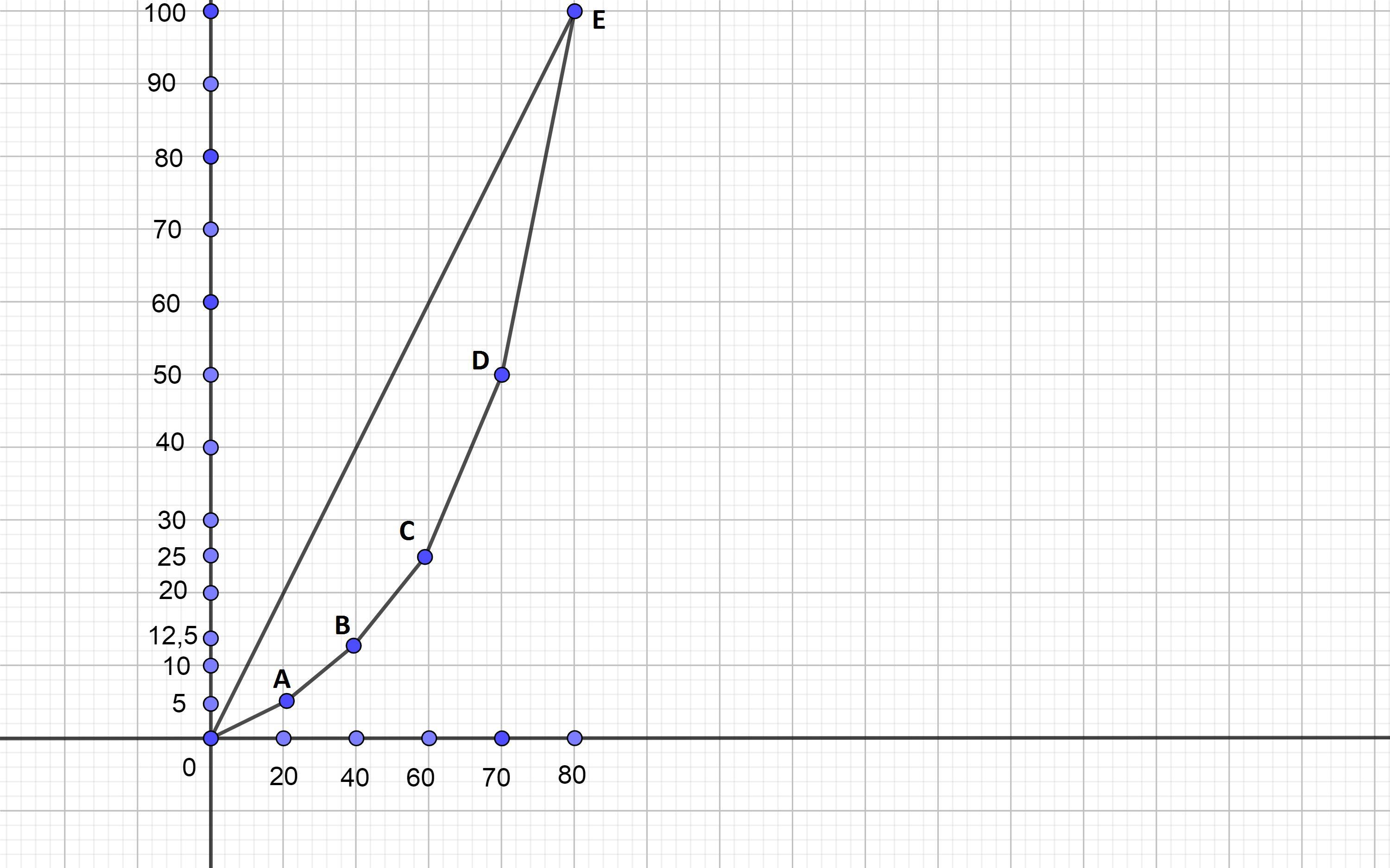 В тридевятом царстве проживают только 5 жителей: Иванушка-дурачок, Василиса Премудрая, Баба Яга, Кощей Бессмертный и Андрей-стрелок. Доходы между ними распределяются следующим образом: Иванушка-дурачок – получает 50 монет в месяц; Андрей-стрелок – 75 монет; Баба Яга – 125 монет; Василиса Премудрая – 250 монет; Кощей Бессмертный – 500 монет. Постройте кривую Лоренца для этого царства. Можно с графиком пж