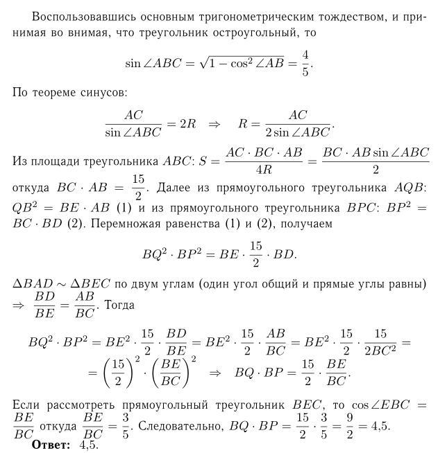 В остроугольном треугольнике АВС проведены высоты AD и CE. На отрезке AD выбрана точка P, а на отрезке CE выбрана точка Q так, что углы AQB и CPB – прямые. Найдите произведение BP•BQ , если известно, что площадь треугольника ABC равна 3, а cos(ABC)=3/5.
