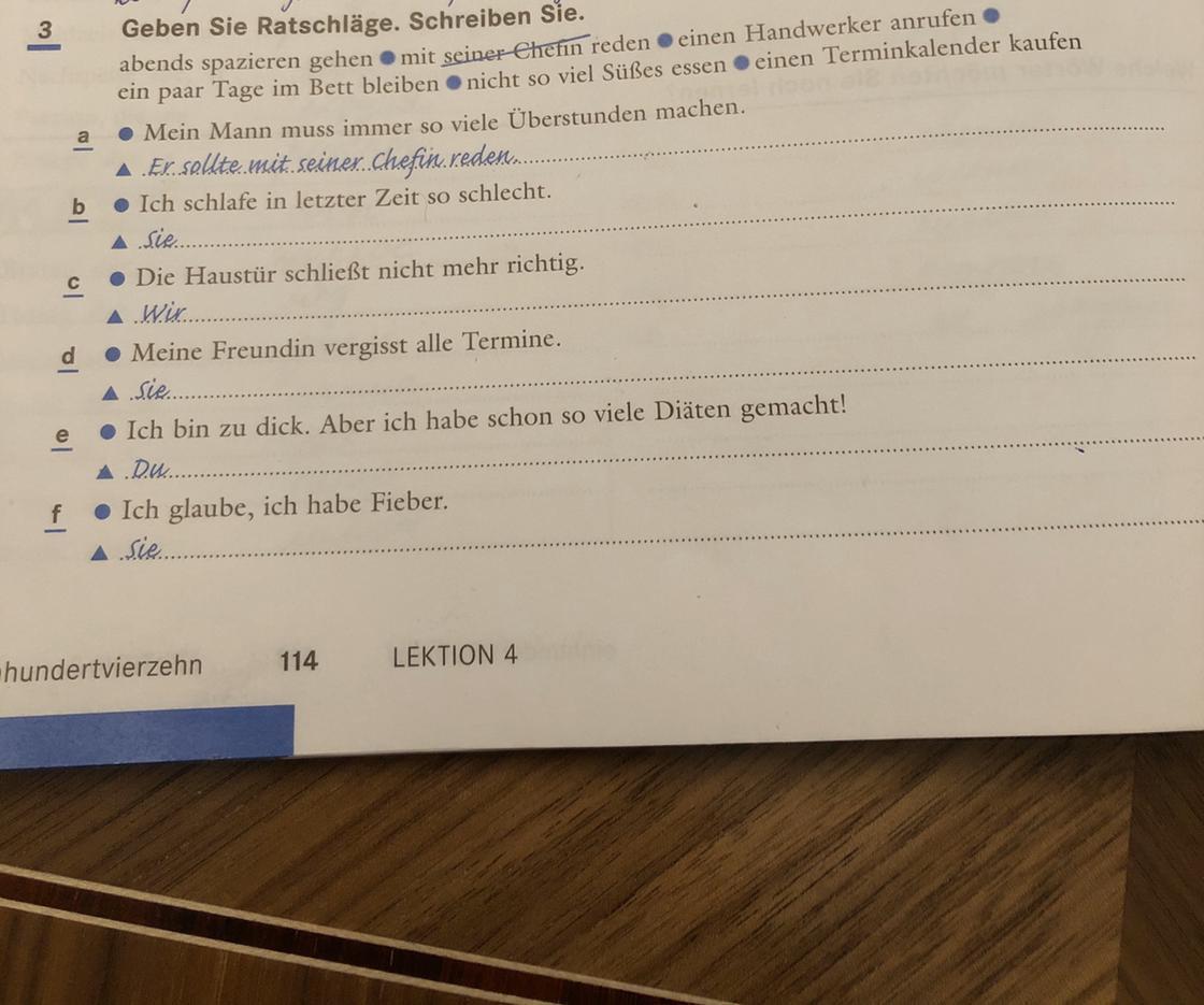 f) Sie sollten ein paar Tage im Bett bleiben.