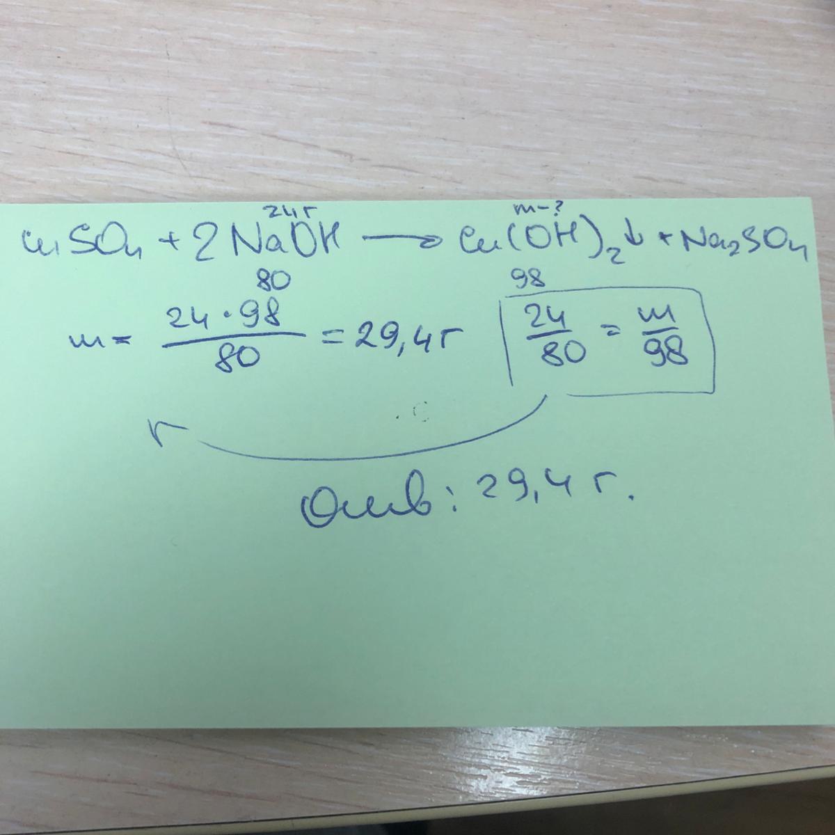 По схеме реакции CuSO4+NaOH=Cu(OH)2+Na2SO4 определите массу образованного осадка ,если в реакцию вступило 24г гидроксида натрия.