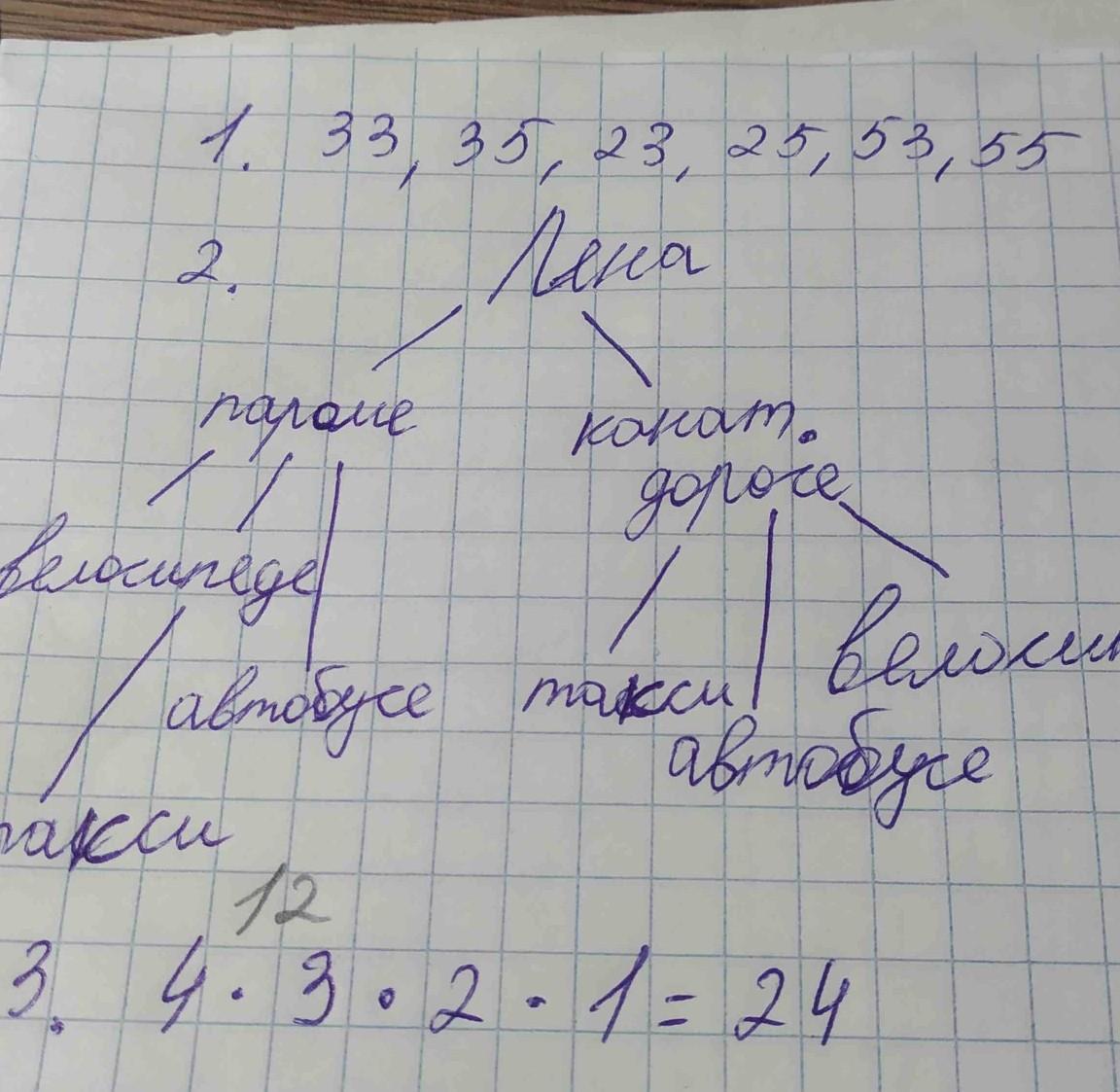 2Лена поедет в гости к подруге, первую часть пути она может преодолеть на пароме или канатной дороги, вторую часть пути на велосипеде, автобусе или такси. сколько возможных вариантов маршрута у есть у Лены?Решение методом составление дерева возможных вариантов.