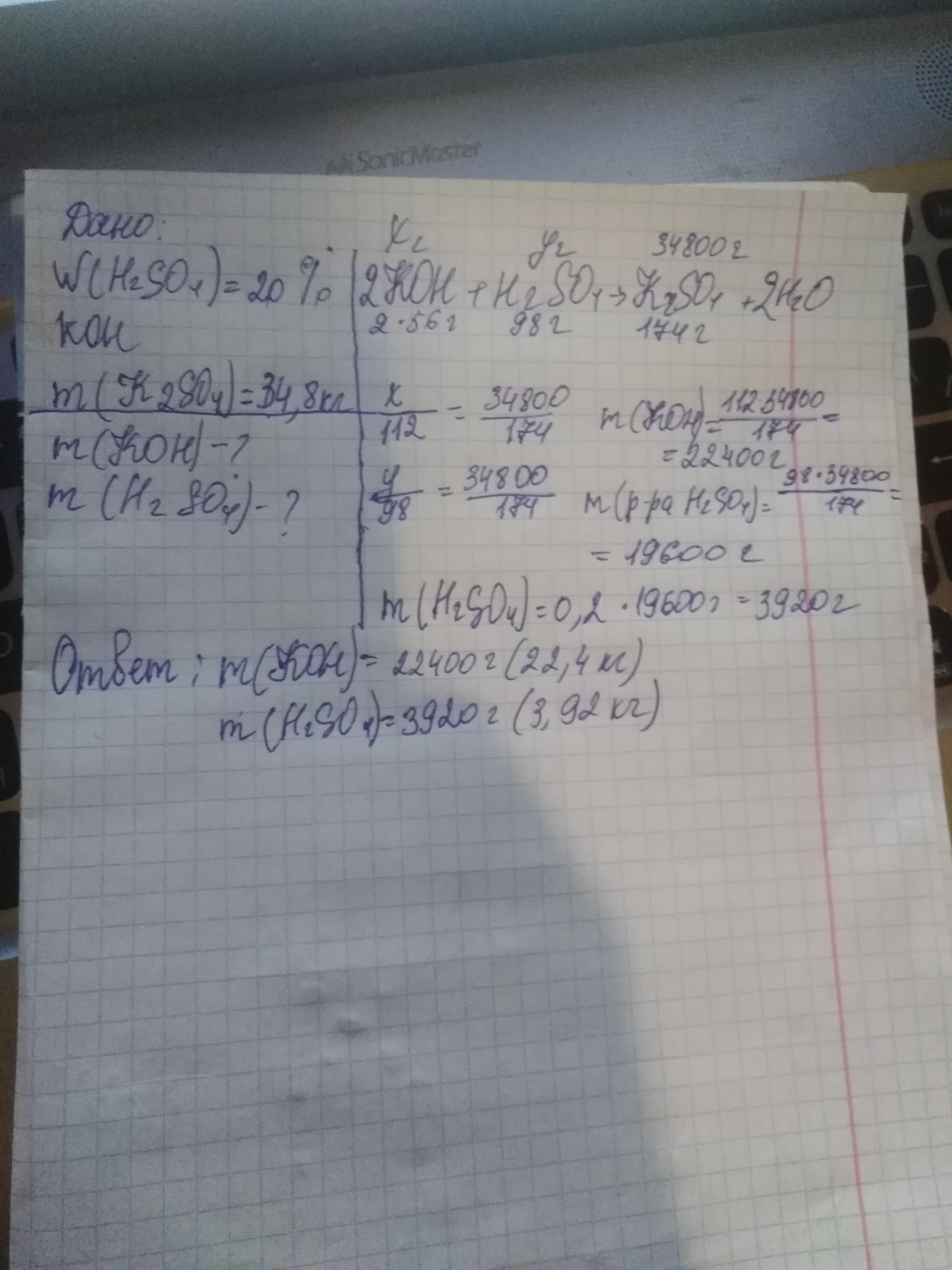 Найдите массу гидроксида калия и 20%-ной серной кислоты, необходимых для получения 34,8 кг сульфата калия.