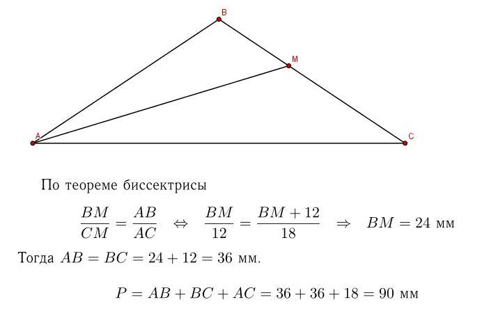 в равнобедренном треугольнике ABC основание AC равно 18 мм и биссектриса AM делит сторону BC, так что MC равно 12 мм .Найдите периметр треугольника