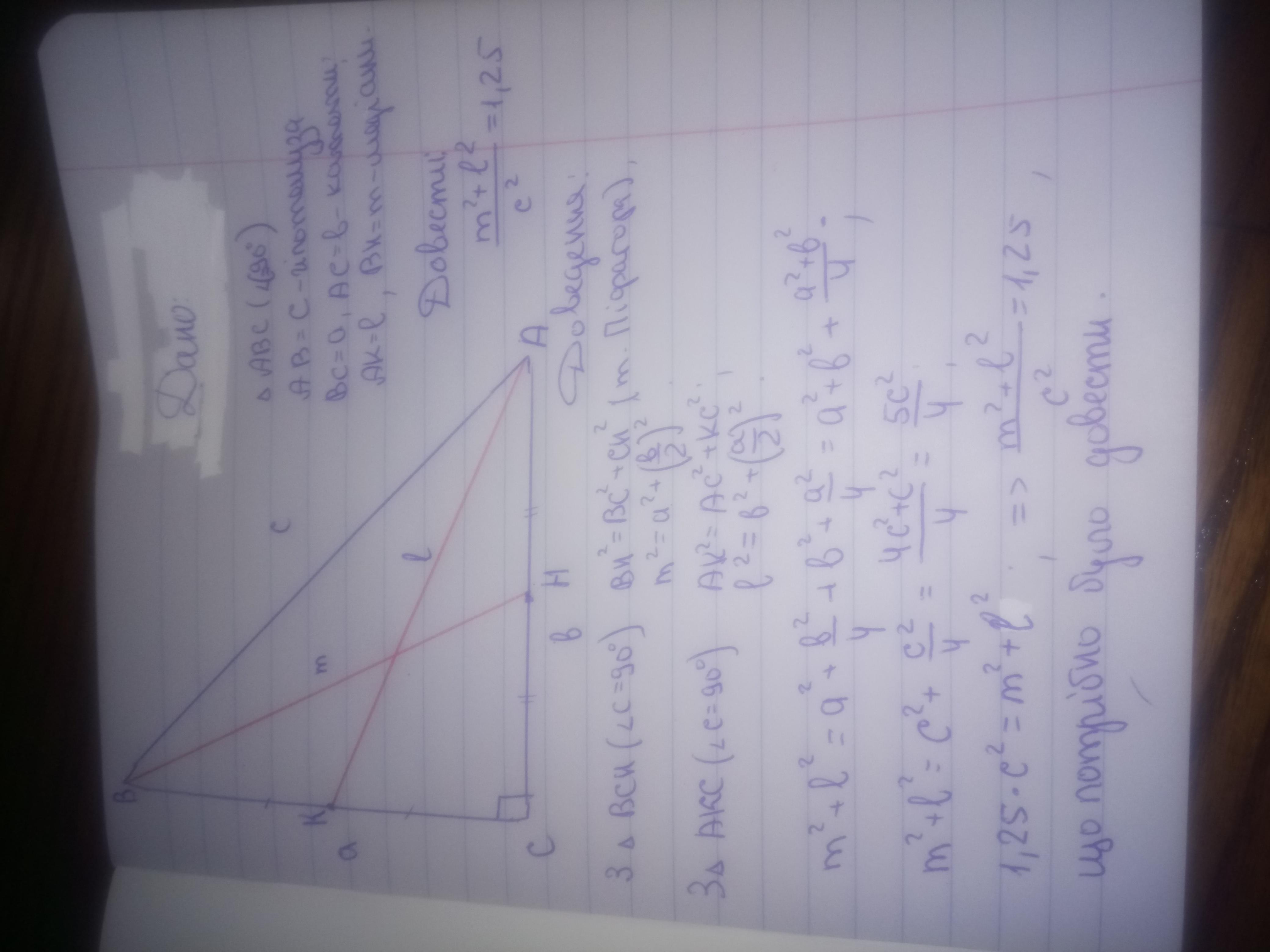 Доведіть що квадрат гіпотенузи прямокутного трикутника в 1,25 разу менший ніж сума кважратів медіан проведених до катетів