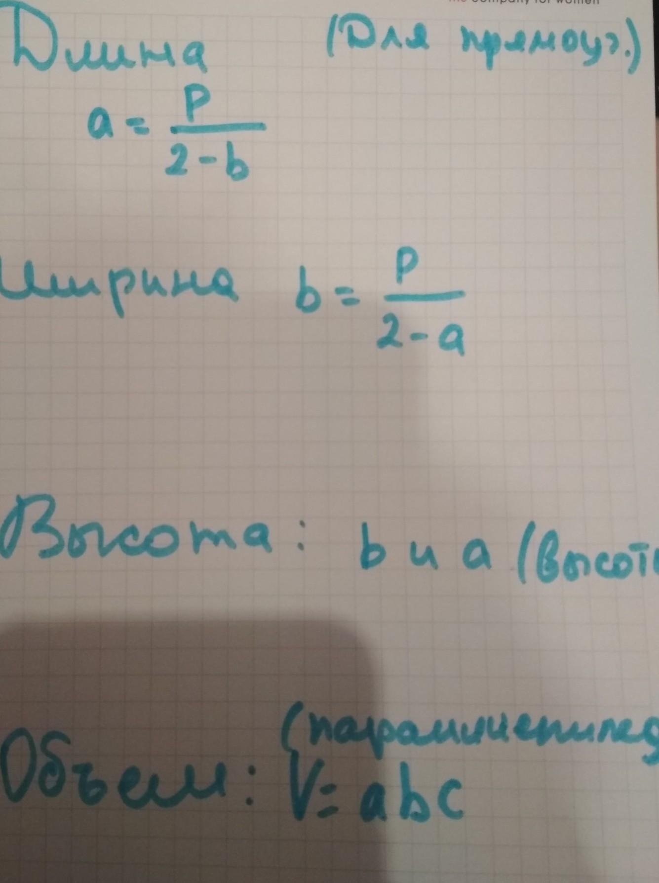 формула объема : V=abc .Для нахождения высоты требуется составить формулу с=V:ab,для ширины составим такую формулу: a=V:bc,и составим формулу для нахождения длины: а=V:bc