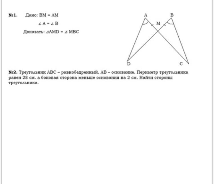 1:(объясню кратко) кут AMD и кут BMC – вертикальные,а значит что кут AMD=BMC. Тогда треугольник DAM=CBM–за двумя сторонами и кутом между ними.