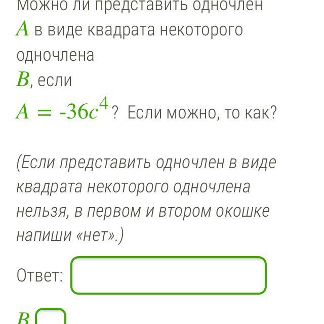 Ответ: одночлен А нельзя представить в виде квадрата некоторого одночлена В .