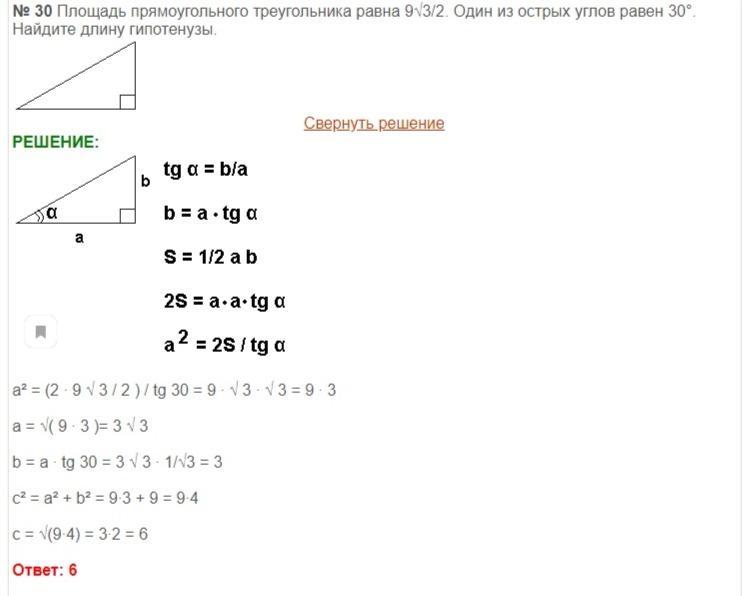Площадь прямоугольного треугольника равна (рисунок), а острый угл равен 30. Найдите гипотенузу
