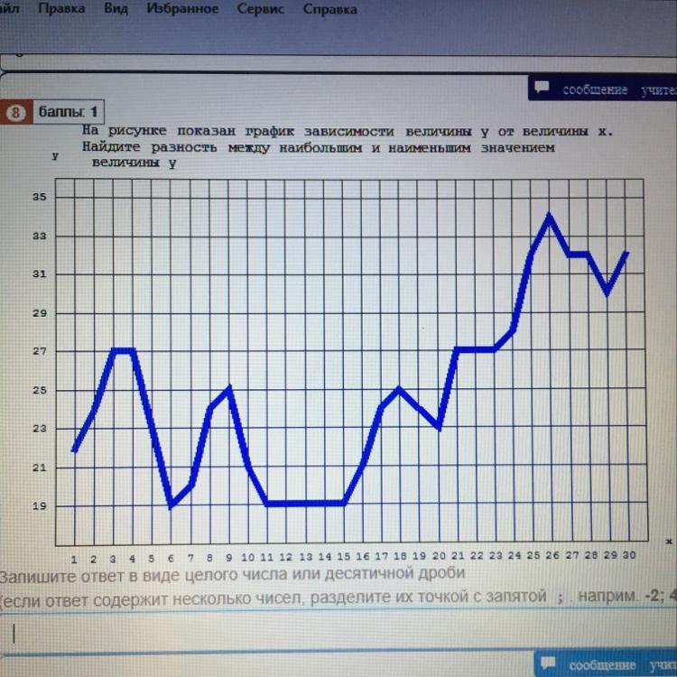 ориентируясь на рисунок можно смотреть, что наибольшее значение у = 34, а наименьшее = 19