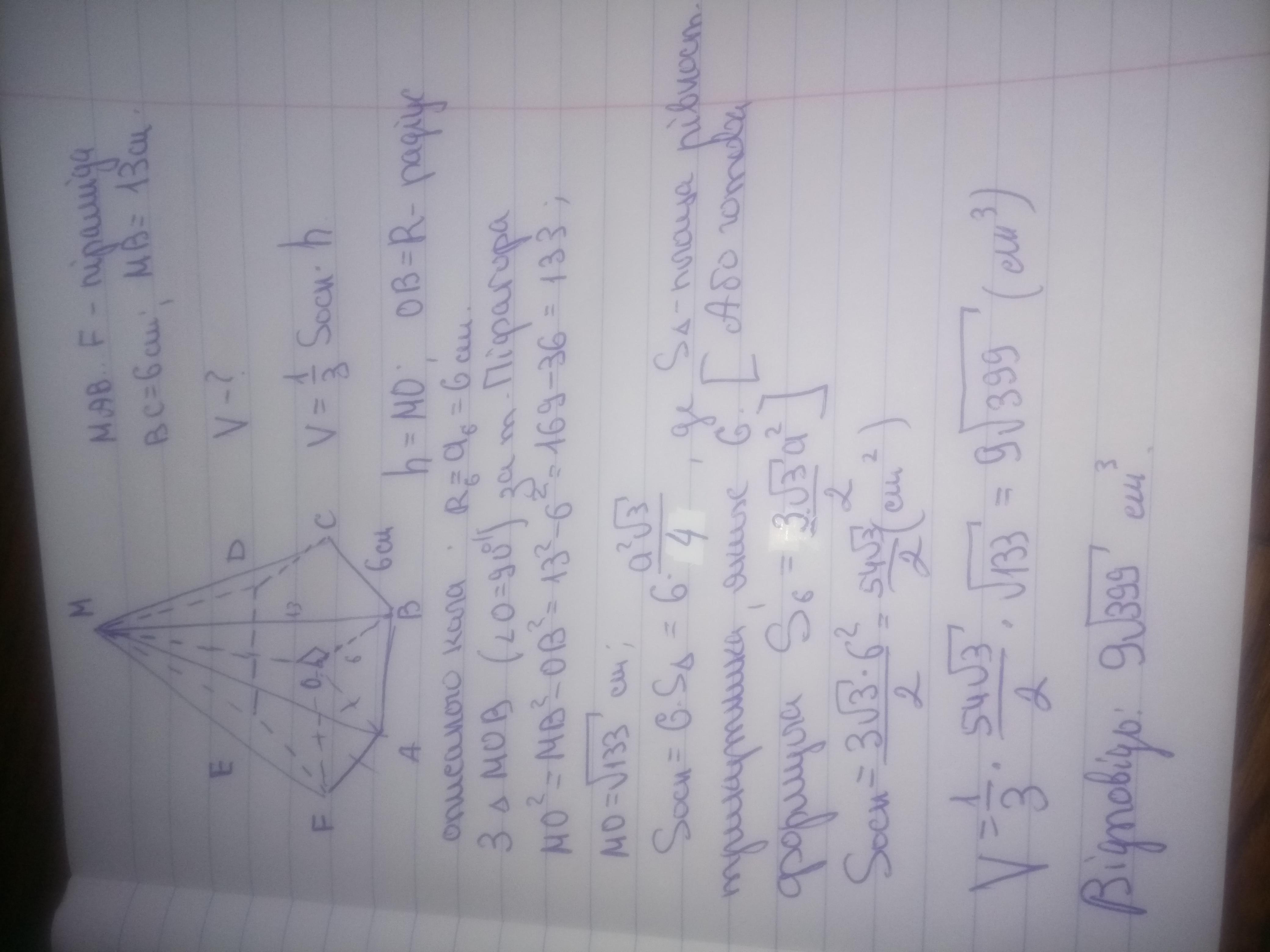 сторона основи правильної шестикутної піраміди дорівнює 6 см, а бічне ребро 13. Знайти об'єм піраміди