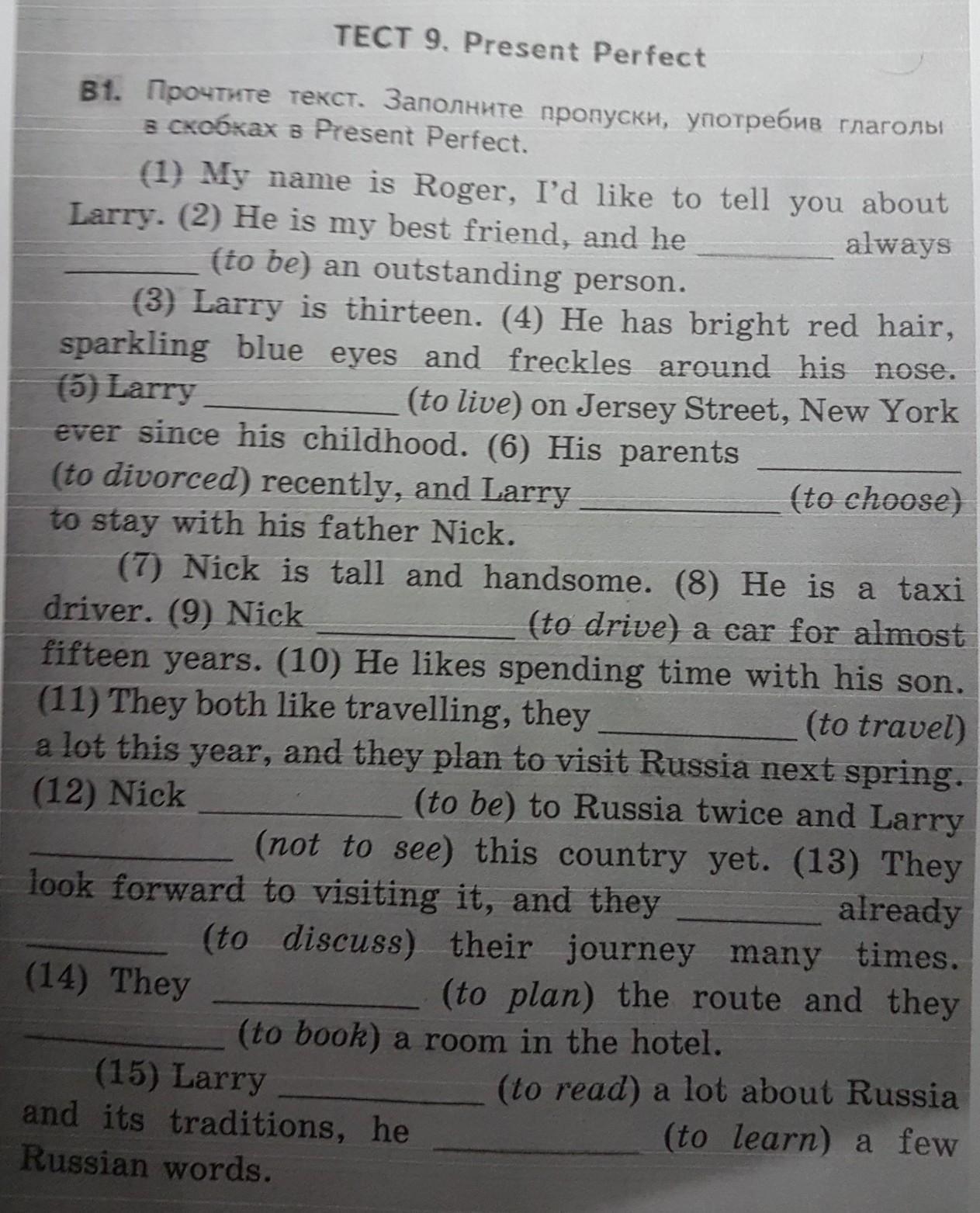 Nick is tall and handsome. He is a taxi driver. Nick HAS DRIVEN a car for almost fifteen years. He likes spending time with his son. They both like travelling, they HAS TRAVELLED a lot this year, and they plan to visit Russia next spring. Nick HAS BEEN to Russia twice and Larry HASN'T SEEN this country yet. They look forward to visiting it, and they HAVE already DISCUSSED their journey many times. They HAVE PLANNED the route and they HAVE BOOKED a room in the hotel.