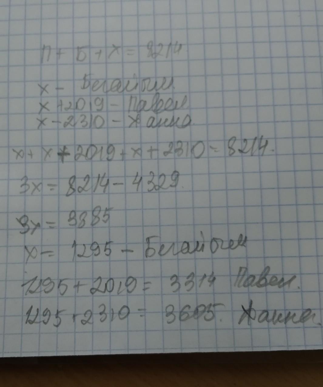 Павел, Бегайым и Жанна в октябре получили прибыль 8214 сомов , причем Павел получил на 2019 сомов больше чем Бегайым а Жанна на 2310 сомов меньше чем Бегайым .какую прибыль получил Павел?