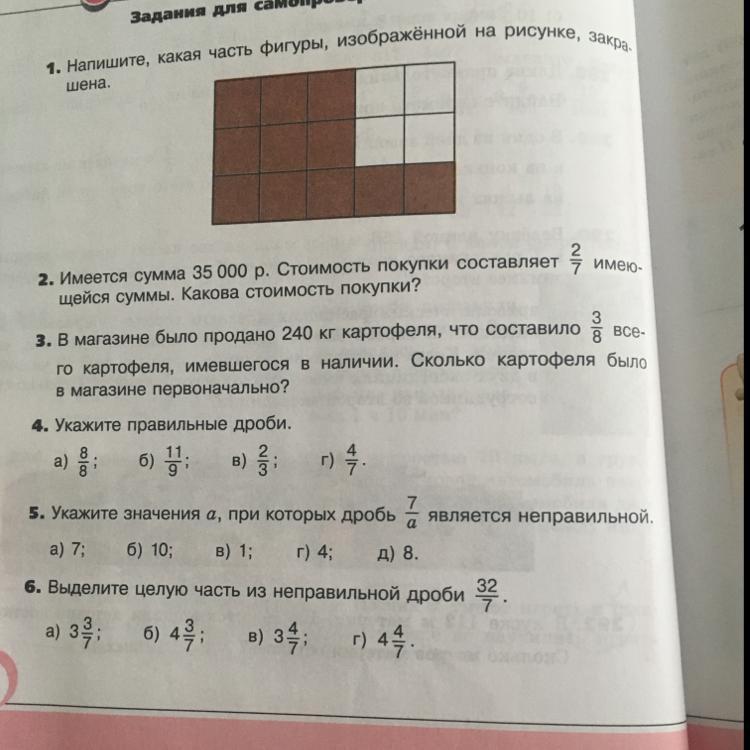 5.Дробь 7/а будет неправильной ,если на место а поставить числа :7,1,4 ,ведь получатся дроби :7/7, 7/1, 7/4.