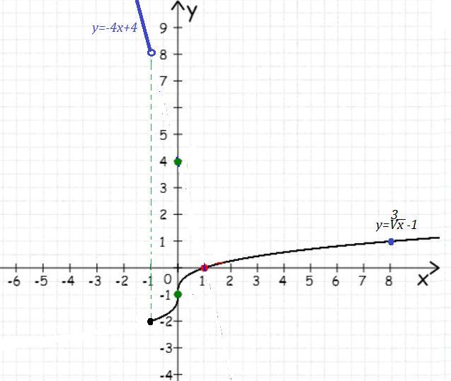 y= -4x+4 - это прямая, проходящая через точки (-1,8) и (0,4). Так как данная прямая должна быть нарисована при x< -1, то часть прямой, лежащей правее прямой х= -1 стираем на чертеже. А также выкалывается точка (-1,8) .