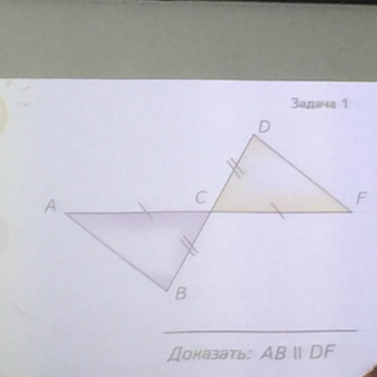 Значит, треугольники равны по двум сторонам и углу между ними. Если треугольники равны, то все элементы у них равны: угол ВАС равен углу DFC. Это накрест лежащие углы при секущей АF. Значит, АВ//DF по равенству накрест лежащих углов.