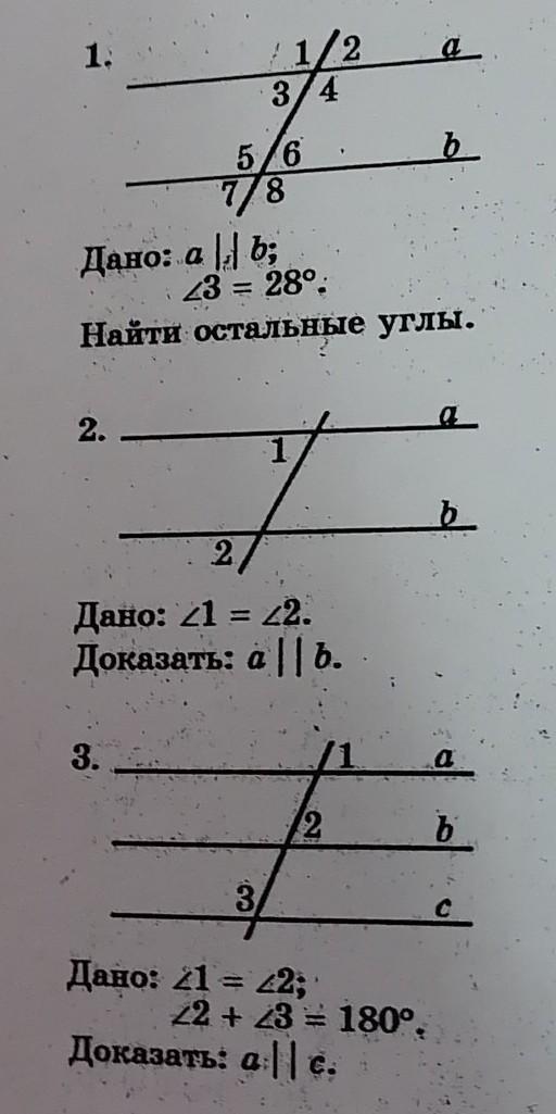 Т.к. а//в, то накрест лежащие углы равны: угол 3= угол 6=28°; и соответственные углы равны: угол 3= угол 7=28°. Вертикальные углы равны: угол 3= угол 2=28°. Сумма смежных углов равна 180°: 180°-угол3=угол1=180°-28°=152°. Угол 1=угол4=152°, т.к. вертикальные. Угол4=угол5=152°, т к. накрест лежащие и угол4=угол8=152°,т к. соответственные.