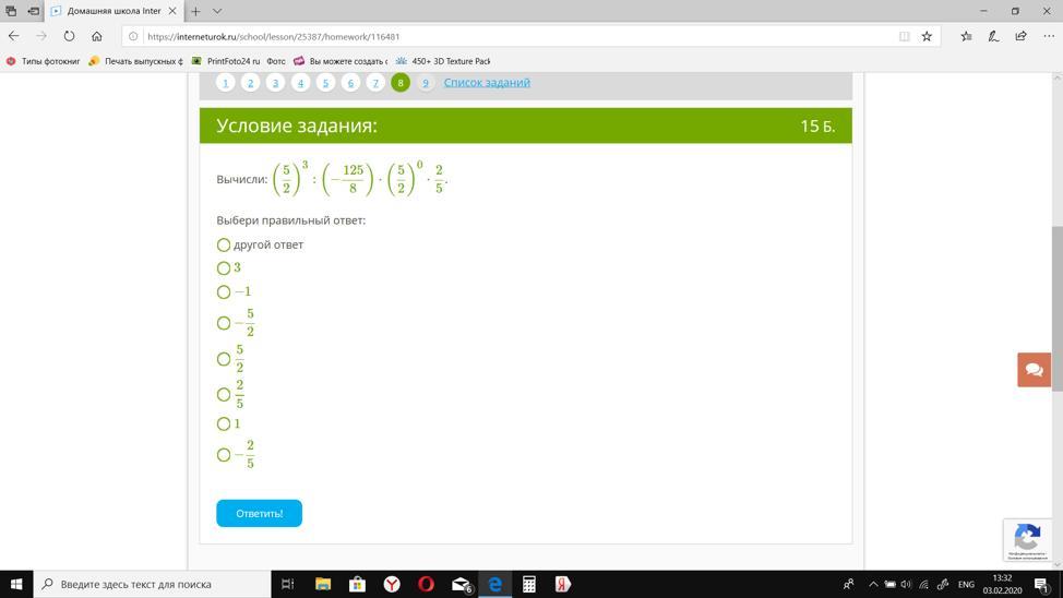 ( 5/2 )³ : (− 125/8 )=( 5/2 )³*(35)³=1
