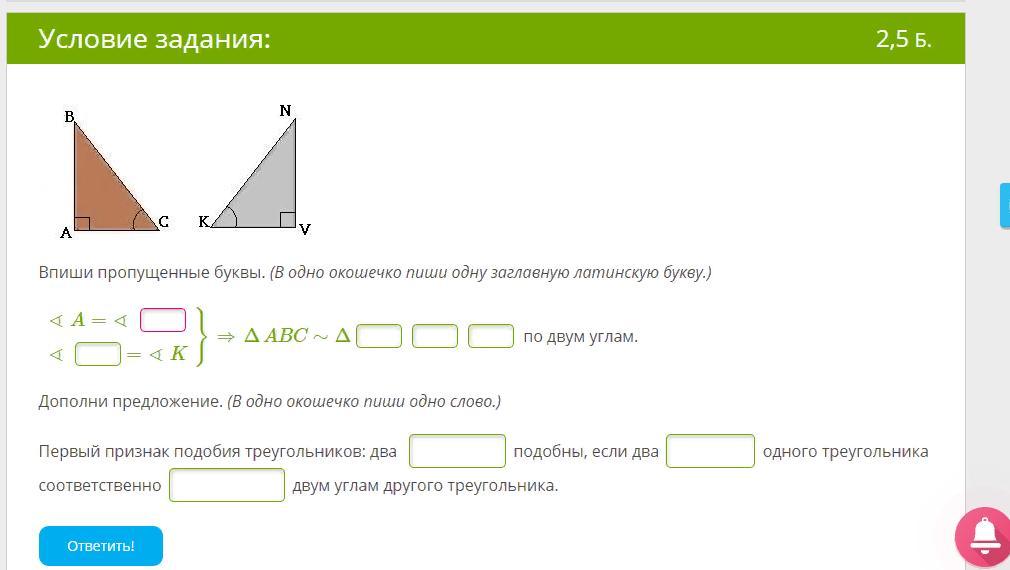 Первый признак подобия треугольников: два треугольника подобны, если два угла одного треугольника соответственно равны двум углам другого треугольника.