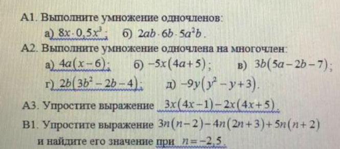 1) 8xcdot0,5x^3=(8cdot0,5)x^{1+3}=4x^4.\2) a)4a(x-6)=4ax-4acdot6=4ax-24a.\g)2b(3b^2-2b-4)=2bcdot3b^2-2bcdot2b-2bcdot4=6b^3-4b^2-8b.\3) 3x(4x-1)-2x(4x+5)=3xcdot4x-3xcdot1-2xcdot4x-2xcdot5=12x^2-3x-8x^2-10x=4x^2-13x.\4)3n(n-2)-4n(2n+3)+5n(n+2)=3n^2-6n-8n^2-12n+5n^2+10n=(3n^2-8n^2+5n^2)+(10n-12n-6n)=-8n=-8cdot(-2,5)=20.