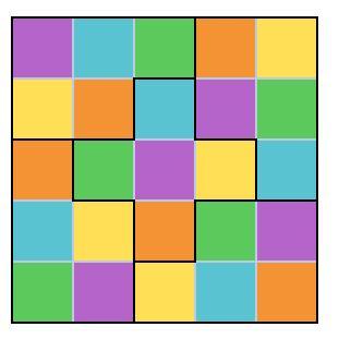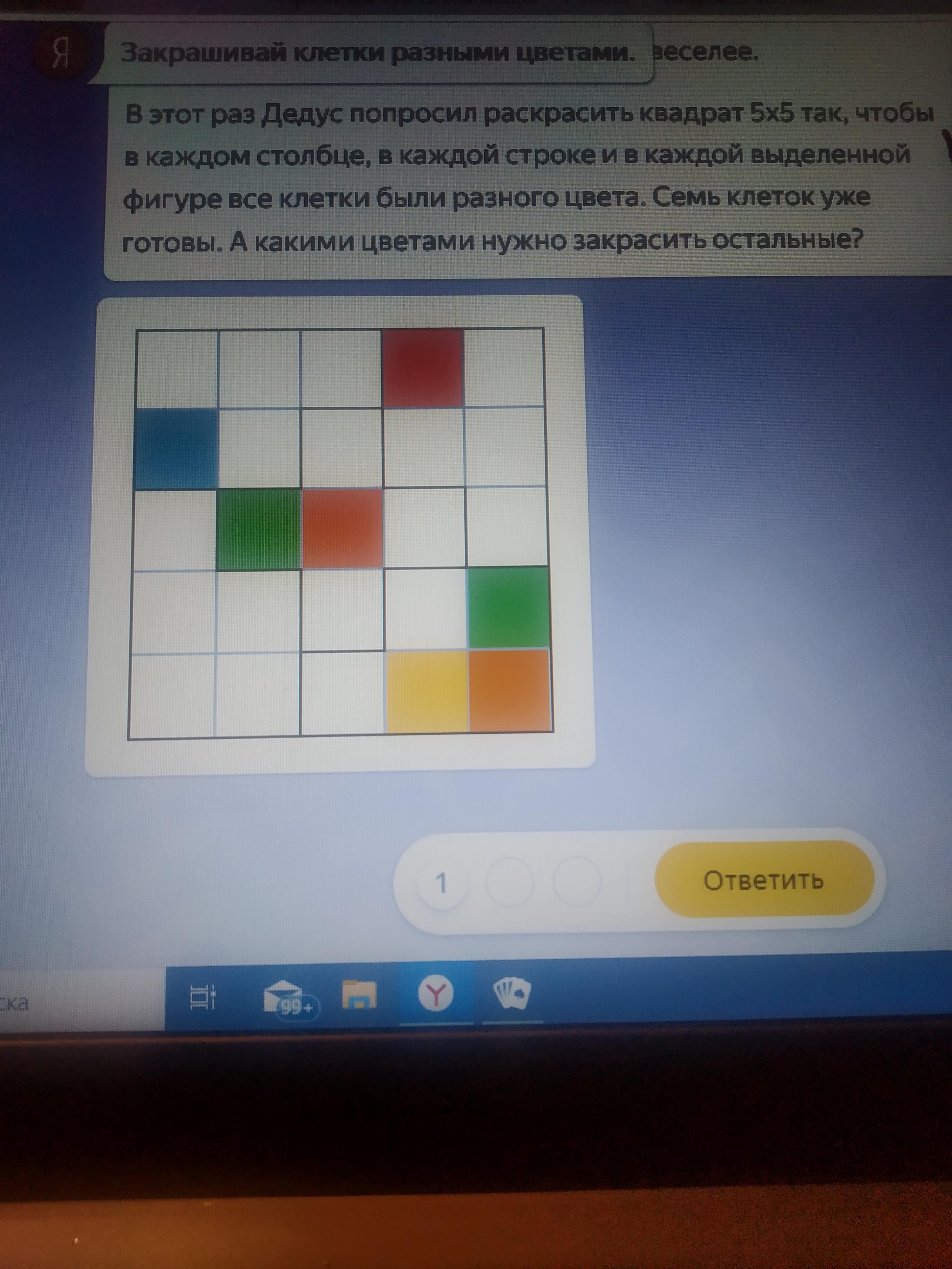 Ни в одном столбике или ряду нет одинаковых цветов.