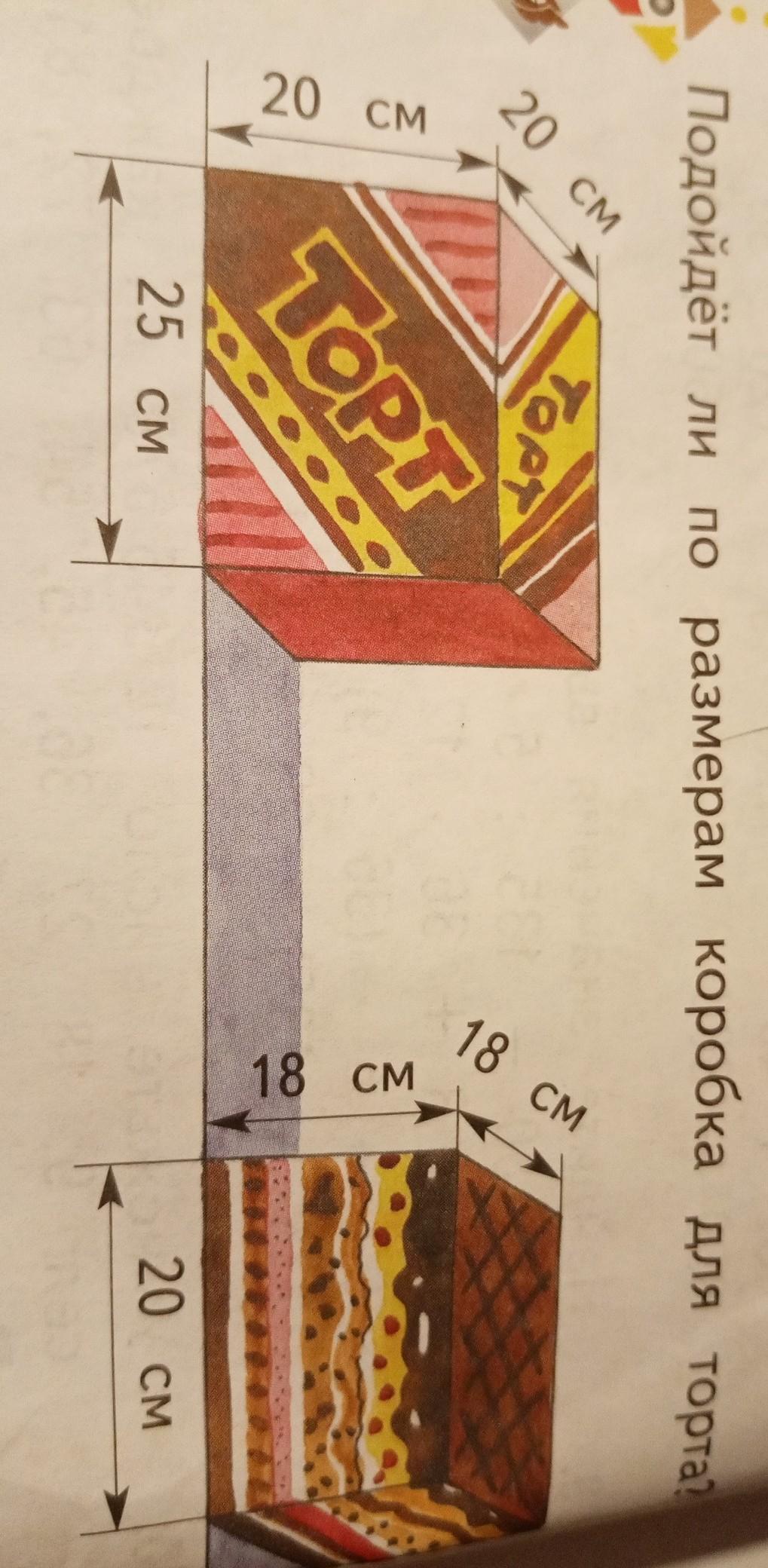 Размеры торта меньше, чем размеры коробки, поэтому коробка подойдёт.