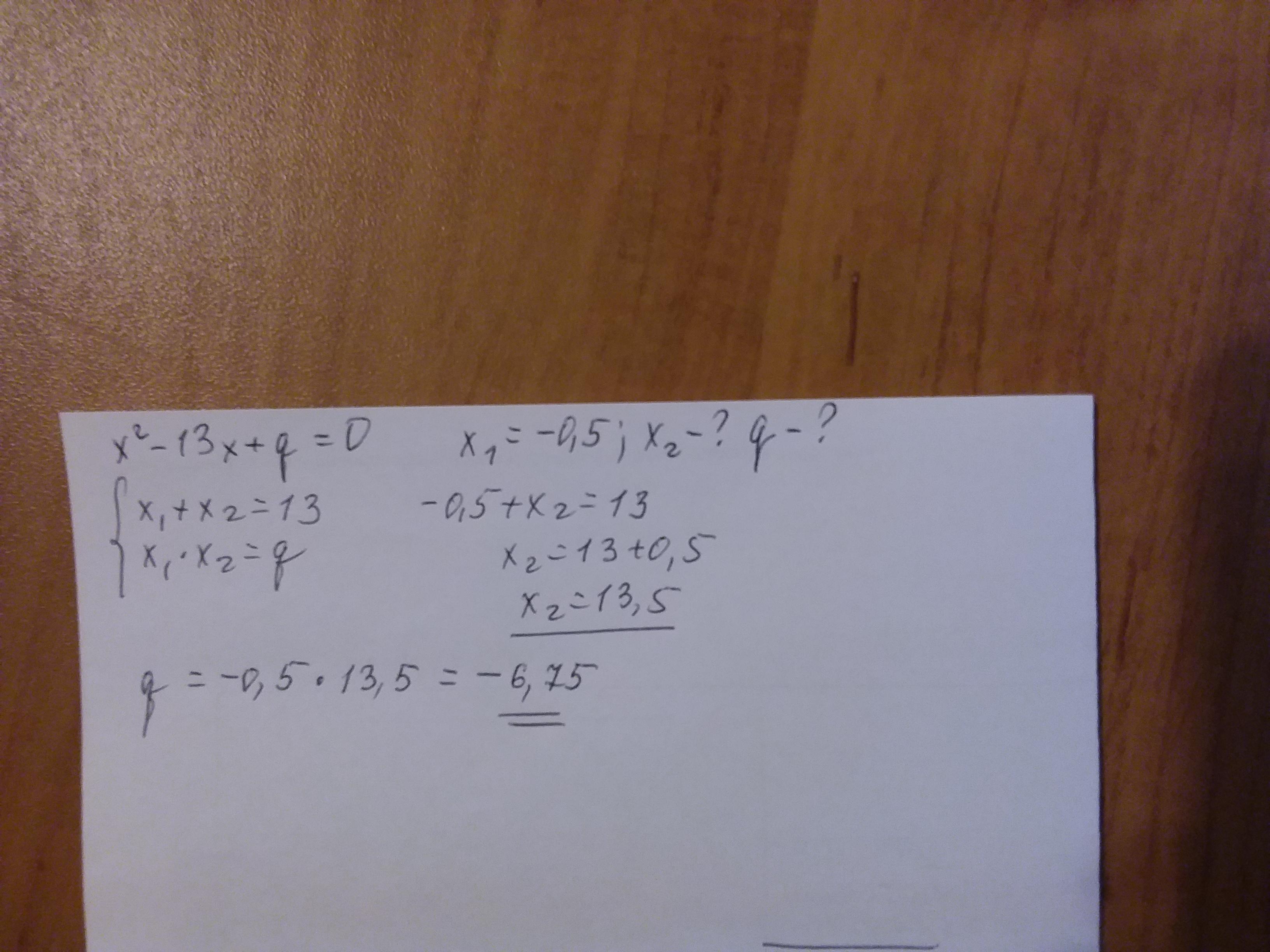 в уравнении x^2-13x+q=0 один из корней равен - 0,5. Найдите второй корень и коэффициент q