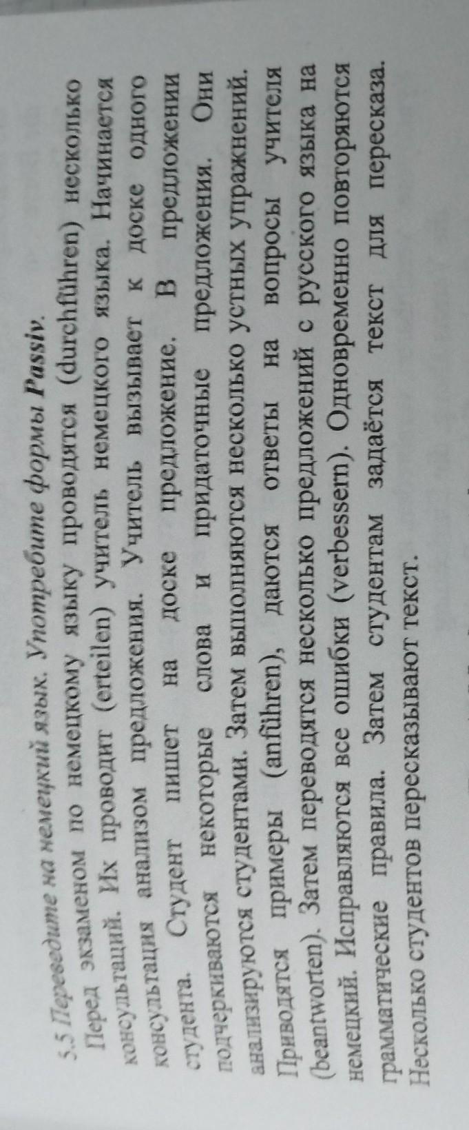 Vor der Deutschprüfung werden einige Studienberatungen durchgeführt. Sie werden von dem Deutschlehrer erteilt. Die Beratung wird mit einer Satzanalyse begonnen. Ein Student wird von dem Lehrer an die Tafel gerufen. Von dem Studenten wird an die Tafel ein Satz geschrieben. Im Satz werden einige Wörter und Nebensätze angestrichen. Sie werden von den Studenten analysiert. Danach werden einige mündliche Übungen gemacht. Es werden Beispiele angeführt, die Fragen des Lehrers beantwortet. Des Weiteren werden einige Sätze aus dem Russischen ins Deutsche übersetzt. Alle Fehler werden verbessert. Gleichzeitig werden grammatische Regeln wiederholt. Dann wird den Studenten ein Text zwecks der Nacherzählung (für die Nacherzählung) bereitgestellt/ angeboten. Von einigen Studenten wird der Text nacherzählt.