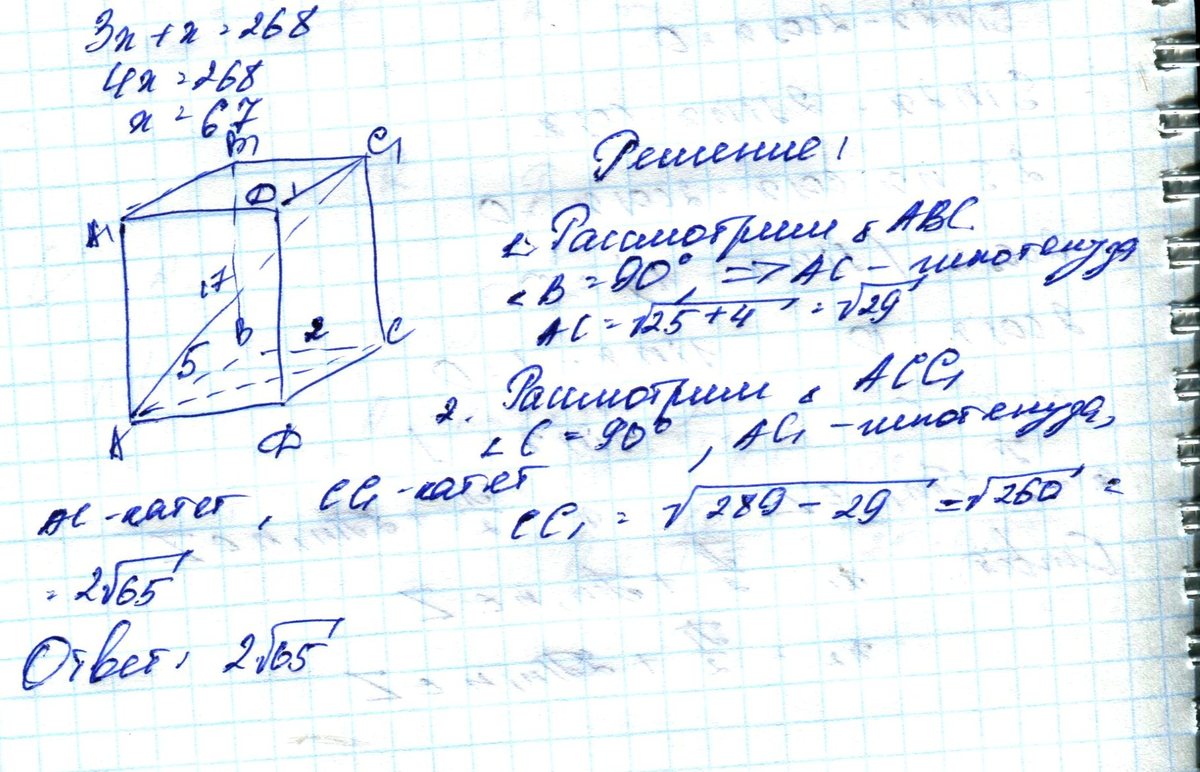 №1.Основной прямой призмы является прямоугольник со сторонами 5 и 2см.Диоганаль призмы равна 17 см. Найдите боковое ребро призмы.