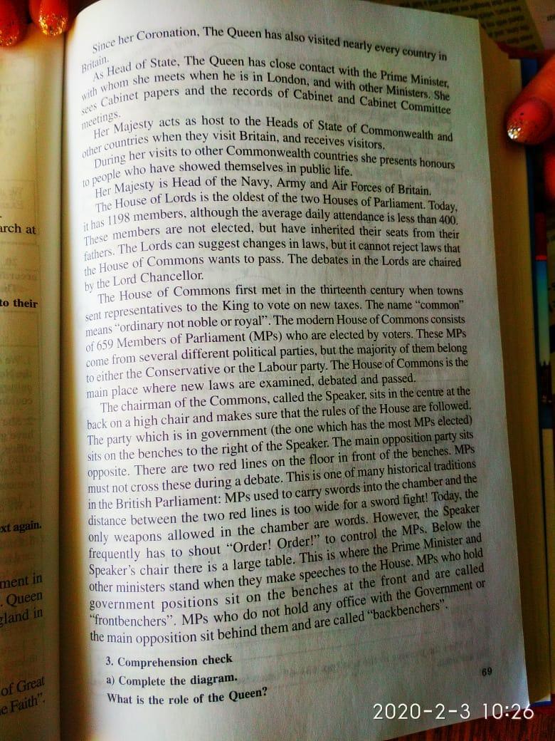 МОНАРХИЯ Британская монархия, безусловно, является старейшим институтом управления в Соединенном Королевстве. Это на четыреста лет старше парламента. Сама королева Елизавета II происходила от саксонских монархов, которые объединили Англию в девятом веке. «Королева правит, но она не управляет». Название королевы в Соединенном Королевстве: «Елизавета Вторая, по милости Бога Объединенного Королевства Великобритании и Северной Ирландии, Глава Содружества, Защитник Веры:Со времени своей коронации королева также посетила почти каждую страну в качестве главы государства. Королева тесно общается с премьер-министром, с которым она встречается, когда он находится в Лондоне, и с другими министрами Ше Ррскуин. Документы кабинета министров и протоколы кабинета министров и Кабинета министров Ее Величество выступает в качестве принимающей стороны глав государств Содружества и правительств. другие страны, когда они посещают Великобританию и принимают посетителей. Во время своих визитов в другие страны Содружества она вручает почести людям, проявившим себя в общественной жизни. peMajesty является главой Военно-морского флота, армии и ВВС Великобритании. Его Палата лордов является старейшей из двух палат парламента. Сегодня члены е, хотя средняя ежедневная посещаемость составляет менее 400, они не избраны, но унаследовали свои места от своих членов. Лорды могут предлагать изменения в законах, но не могут отклонять законы, которые хочет принять Tdouse of Commons. Дебаты в лордах начинаются с лорда-канцлера. Палата общин впервые собралась в тринадцатом веке, когда города послали представителей к королю для голосования по новым налогам. Название «обычный» означает «обычный не дворянский или королевский». Современная палата общин состоит из 659 членов парламента, избираемых избирателями. Эти депутаты представляют несколько разных политических партий, но большинство из них принадлежат либо к консервативной, либо к лейбористской партии. Палата общин является основным местом, где новые законы рассматриваются, обсуждаются и принимаются. Председатель палаты общин, которого называют спикером, сидит в центре на высоком стуле и следит за соблюдением правил палаты. Находящаяся в правительстве партия (та, в которой избрано большинство депутатов) сидит на скамейках справа от спикера. Основная оппозиционная партия сидит напротив. На полу перед скамейками есть две красные линии. Депутаты не должны пересекать их во время дебатов. Это одна из многих исторических традиций британского парламента: депутаты носили мечи в палате, а расстояние между двумя красными линиями слишком велико для боя на мечах! Сегодня единственное оружие, разрешенное в камере, это слова. Тем не менее, спикер часто должен выкрикивать: «Порядок! Порядок!» контролировать депутатов. Под креслом есть большой стол. Это место, где стоят премьер-министр и министры, когда выступают с речами перед палатой представителей. Депутаты, которые занимают промежуточные посты, сидят на скамьях впереди и называются «бантами противников». «Депутаты, которые не занимают никаких постов при правительстве или противостоянии с матерями, сидят за ними и называются« оппонентами ». Проверка понимания a) Заполните диаграмму. роль королевы