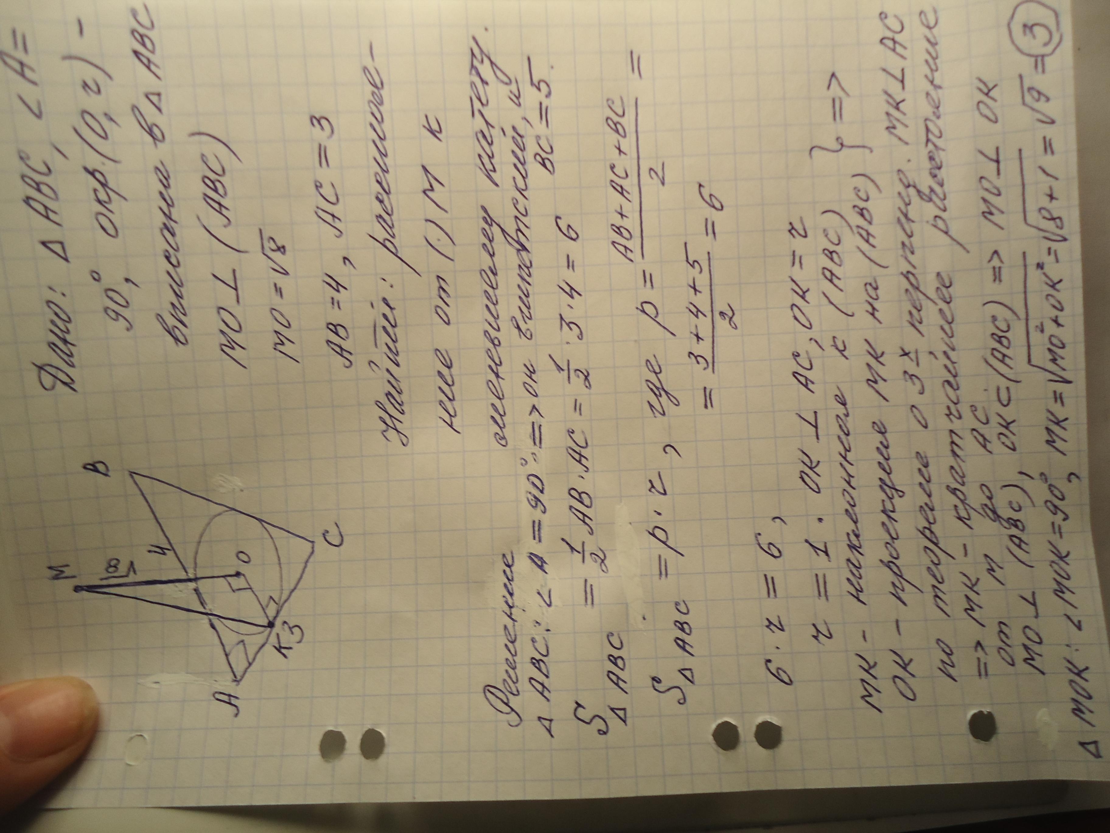 Помогите 15б!!! Из центра O вписанной в прямоугольный треугольник ABC окружности к плоскости этого треугольника проведено перпендикуляр OM = √8 . Найдите длину перпендикуляра, проведенного из точки M к меньшему катету △AВC , Если его катеты равны 3 и 4 .