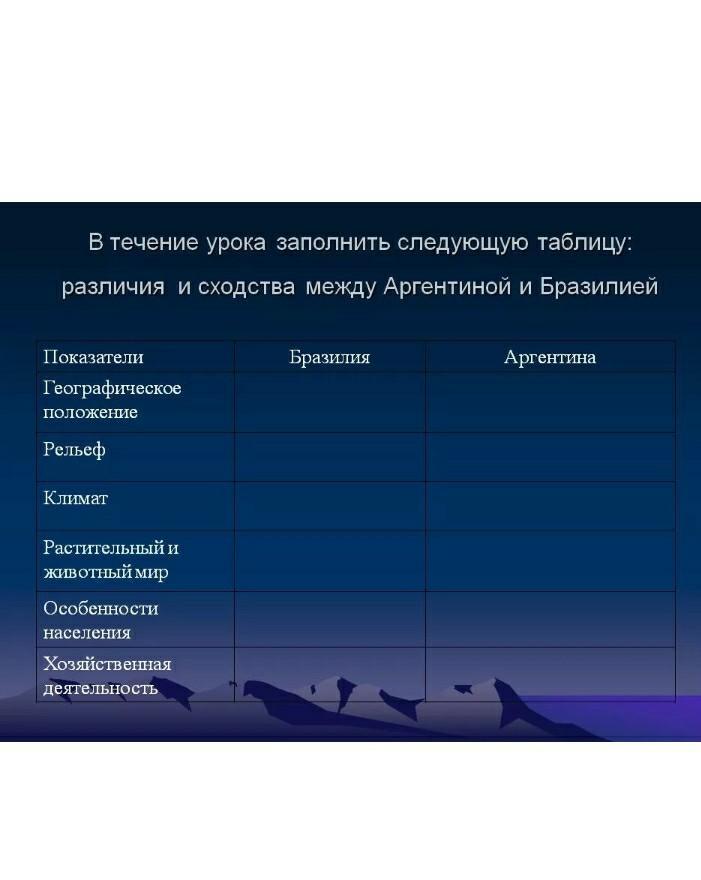 обе страны расположени на 1материке южная Америка . Бразилия в основе своей площади находится в северной Аргентины населения Аргентины представляет собой европейци (испанции и итальянци) (более 95%) . продукция которую вивозит Бразилия апельсини кофе сахарный тростник маниоку и сизалью.в Аргентины в этом плане существует 3главних продукта говядина кукуруза и пшеница . также цитрусовыэ хлопок виноградное вино сорго соя сахарный тростник.