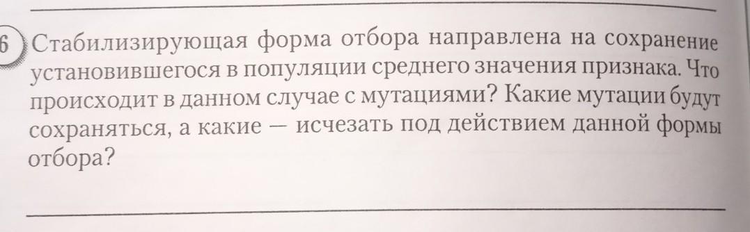 Стабилизирующий отбор — форма естественного отбора, при которой его действие направлено против особей, имеющих крайние отклонения от средней нормы, в пользу особей со средней выраженностью признака. Поэтому виды, подвергшиеся мутациям не смогут выжить.
