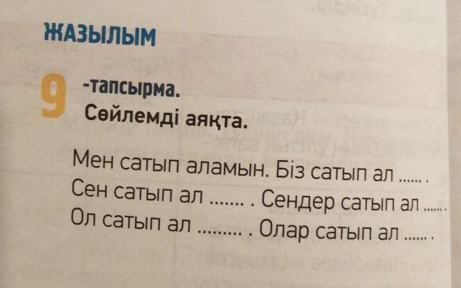 мен сатып аламын, біз сатып аламыз, сен сатып аласың, сендер сатып аласыңдар, ол сатып алады, олар сатып алады.