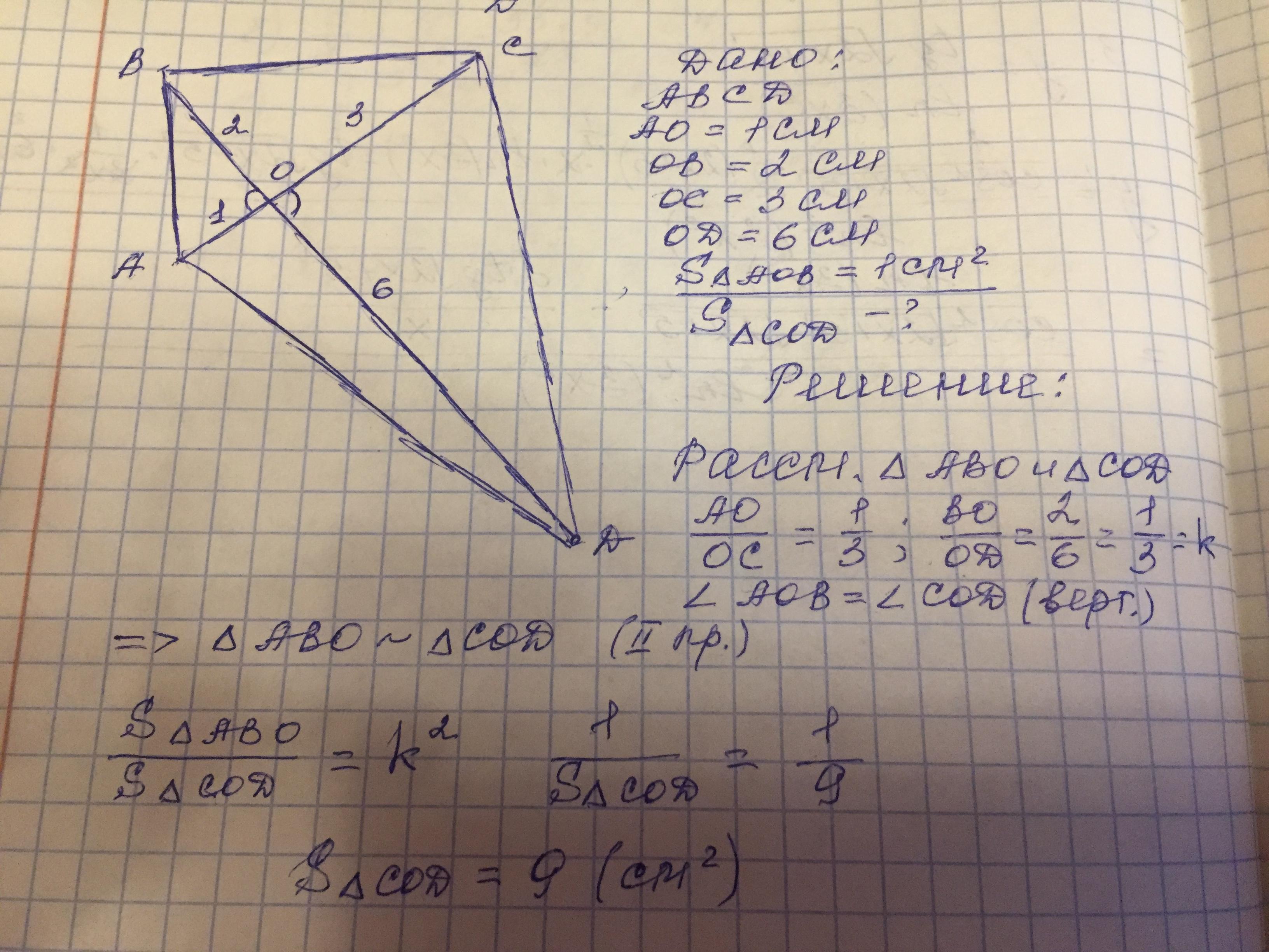 В четырехугольнике ABCD диагонали пересекаются в точке O. Известно что AO=1 см, OB=2 ,см OC=3см , OD=6см . Найдите площадь треугольника COD , если площадь AOB= 1 см в квадрате.