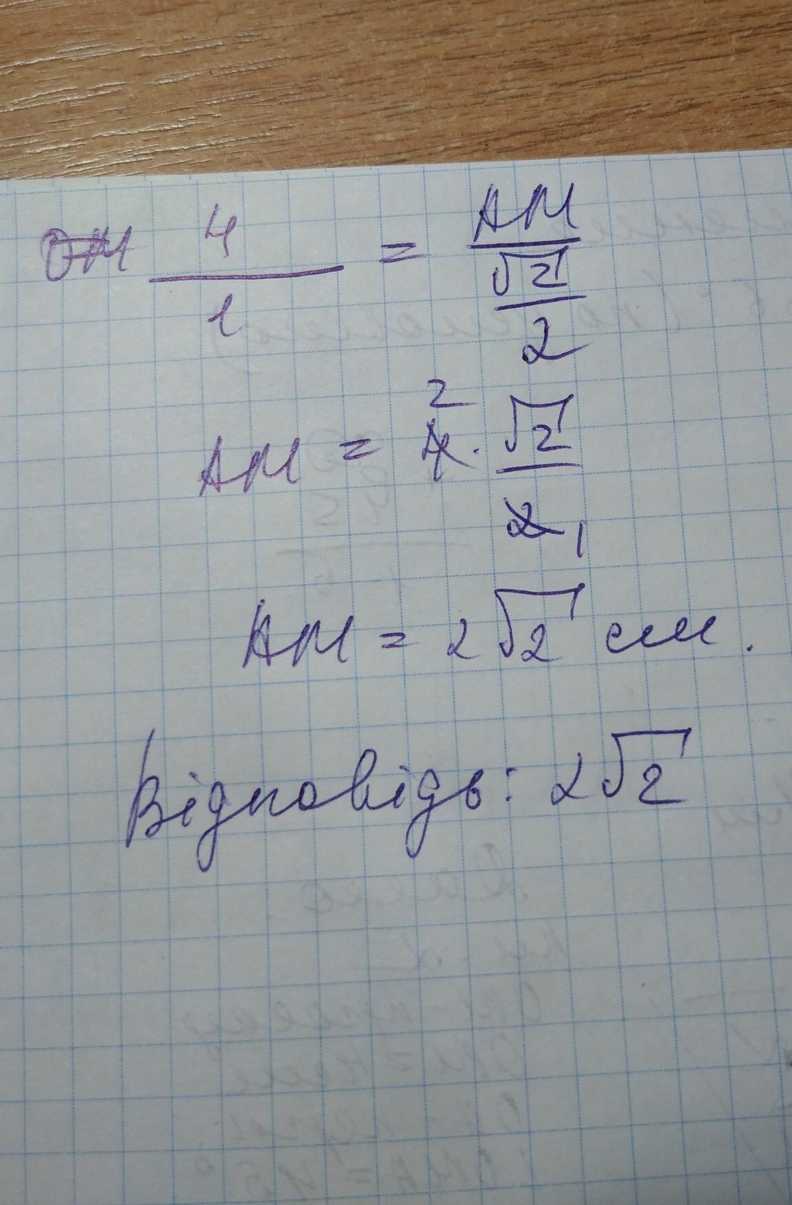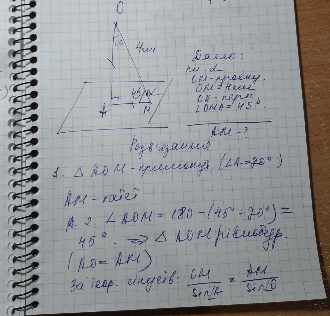 З точки до площини проведено похилу, довжина якої дорівнює 4 см. Знайти проекцію похилої, якщо похила утворює із перпендикуляром кут 45 градусів