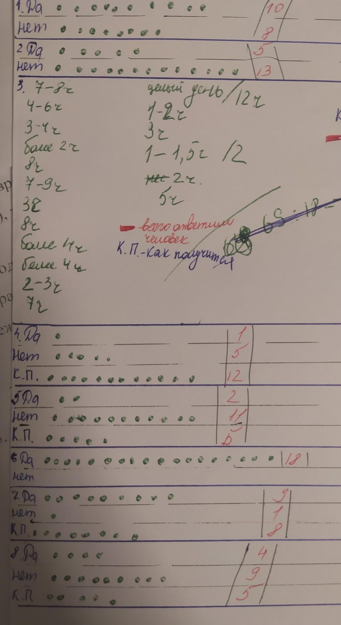 1) На первый вопрос ответили "да" 10 человек из 18 , значит